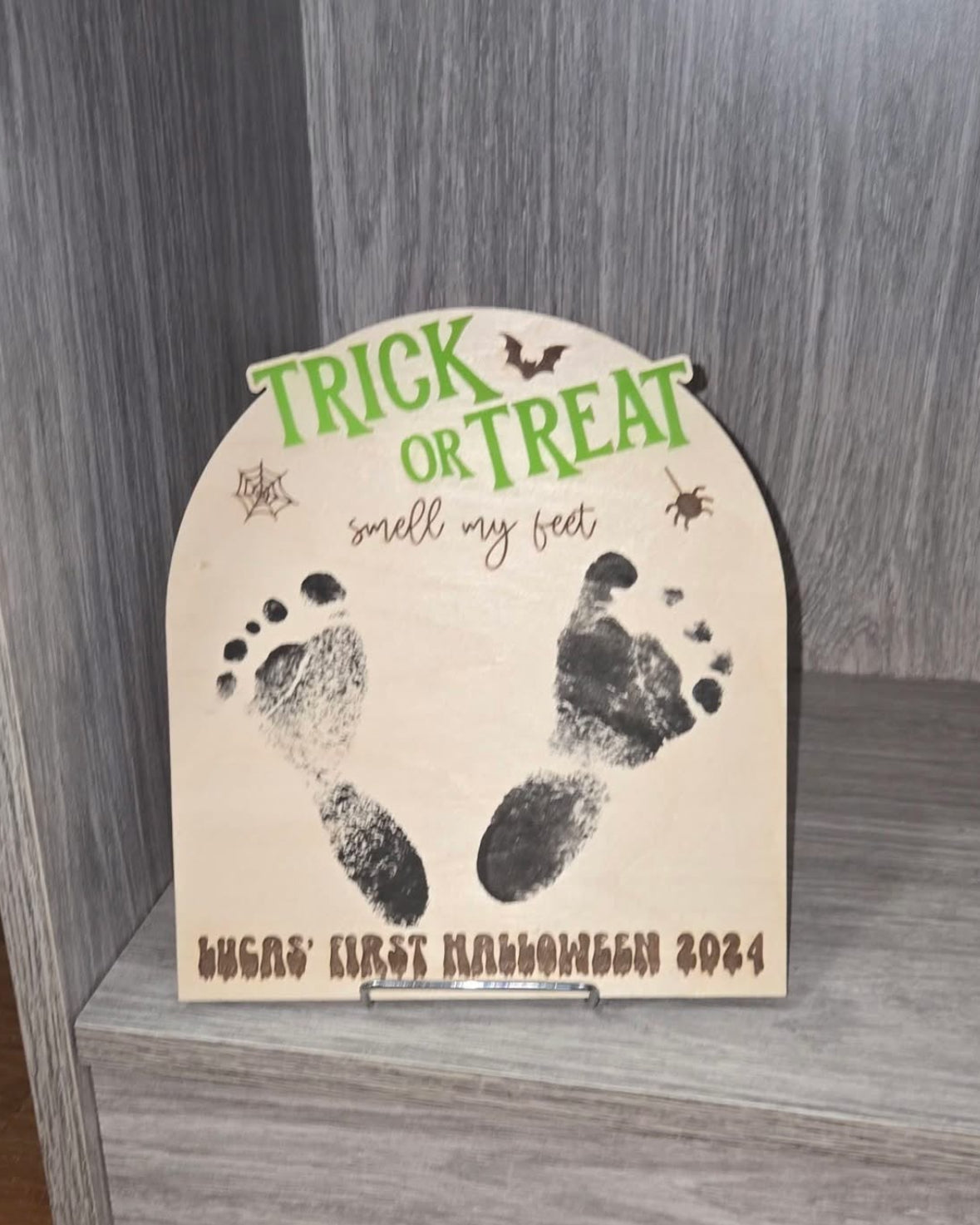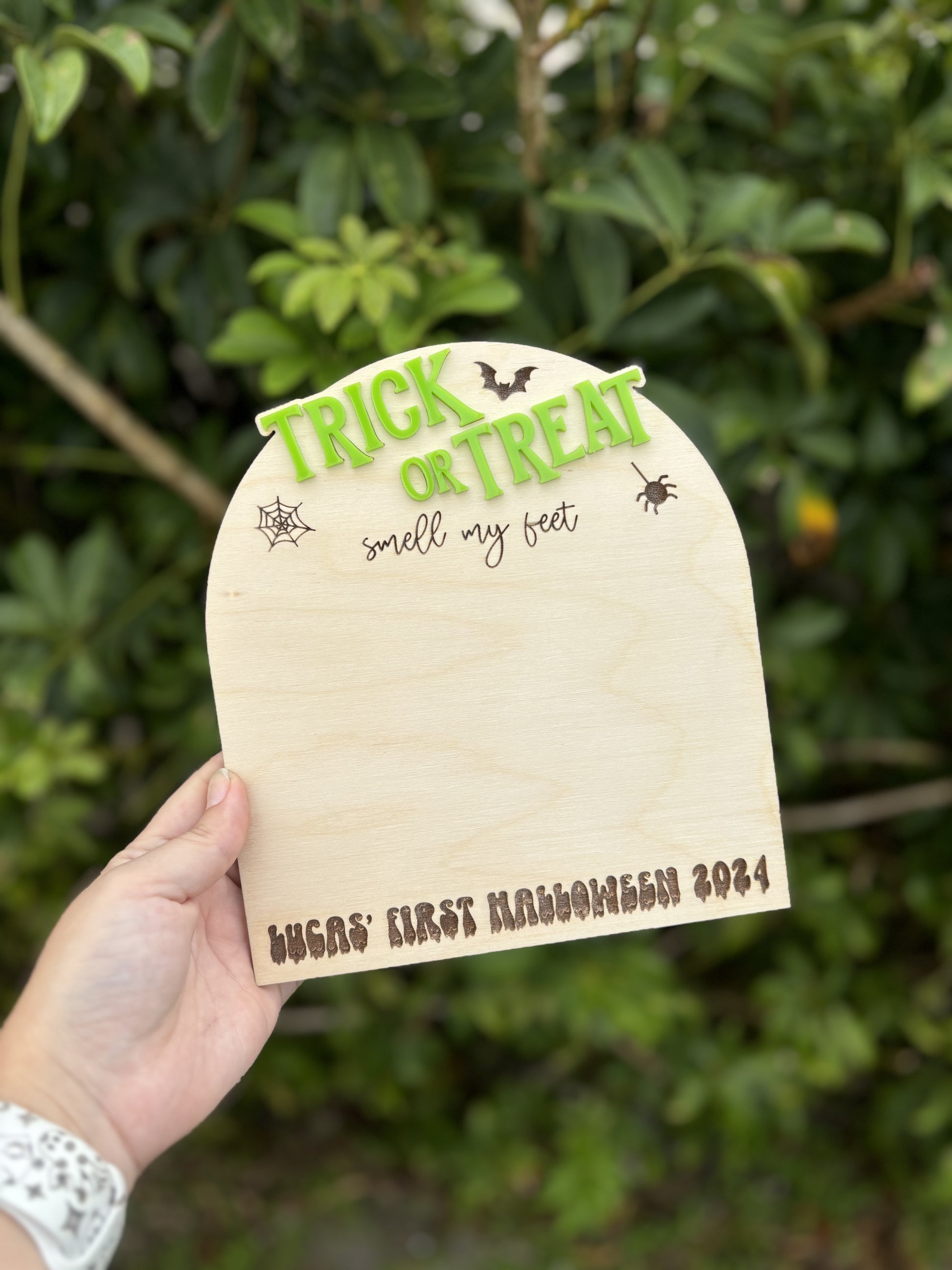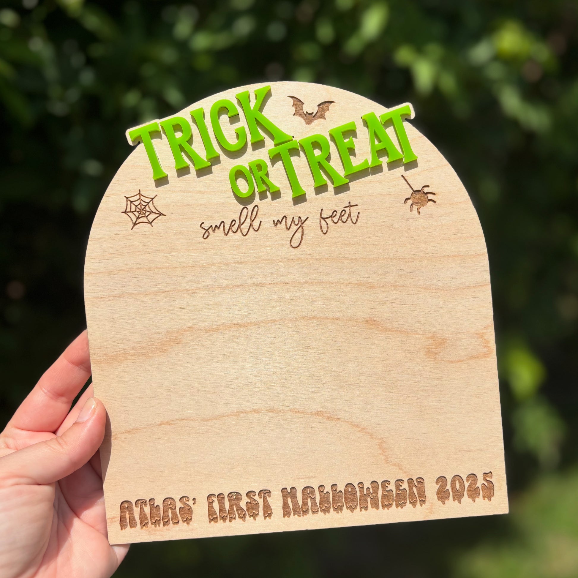 Looking for a unique and adorable gift for your baby's first Halloween in 2025? Look no further than this trick-or-treat smell my feet sign! This sign is engraved and the trick-or-treat section is made of durable and long-lasting acrylic. You can choose from three different colors: slime green, purple or orange, to match your child's personality or the theme of your Halloween party.
