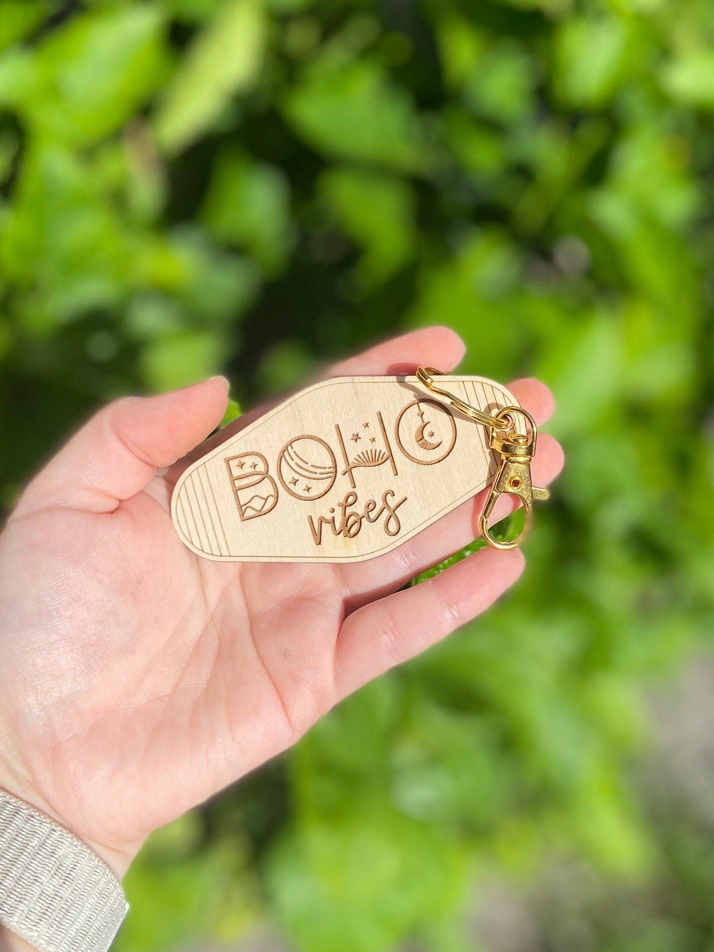 How cute is this Boho vibes keychains? It's great for a keychain or to attach to your bags, diaper bags and more! The image is engraved into wood so no worries of the image coming off.