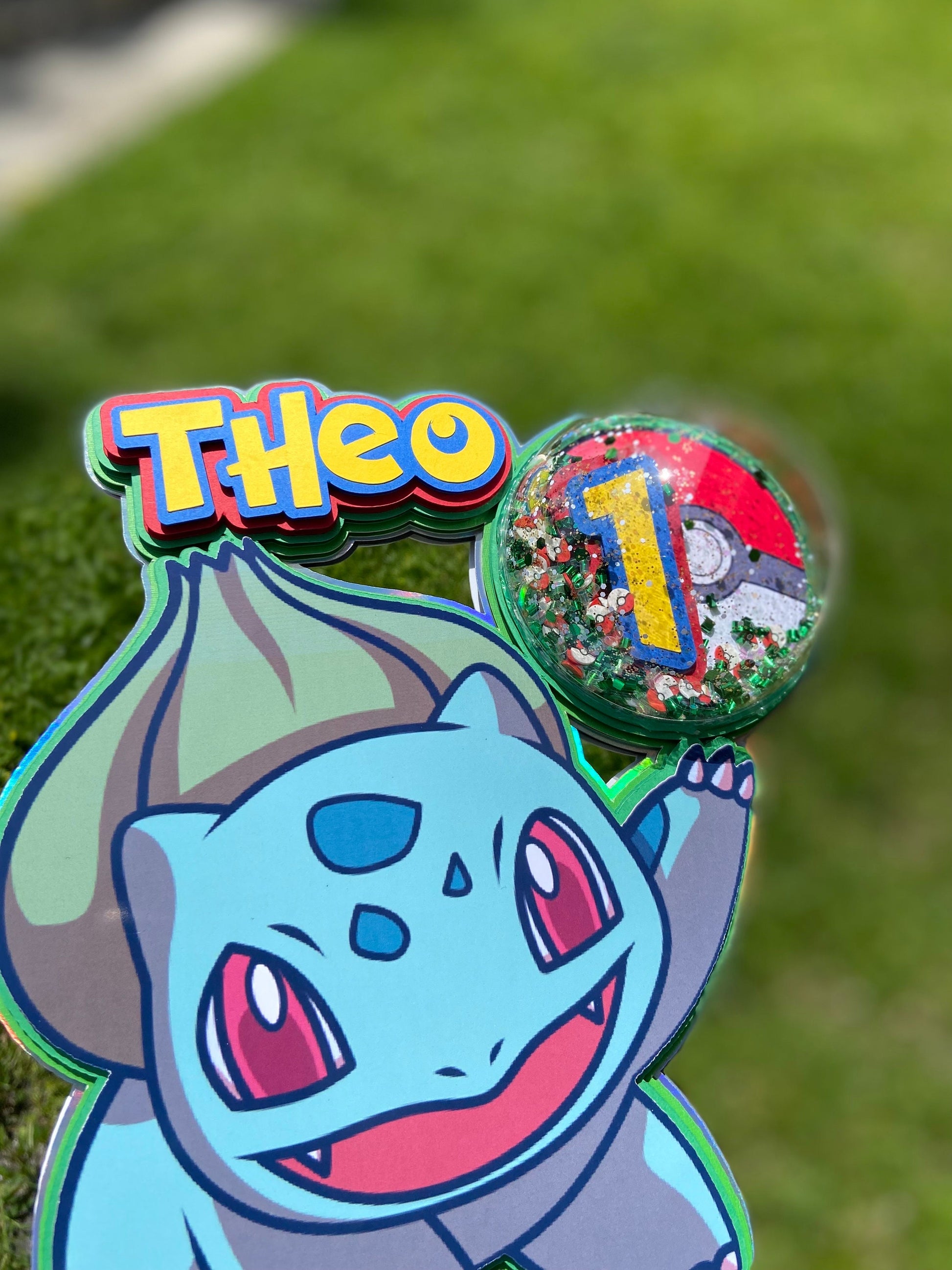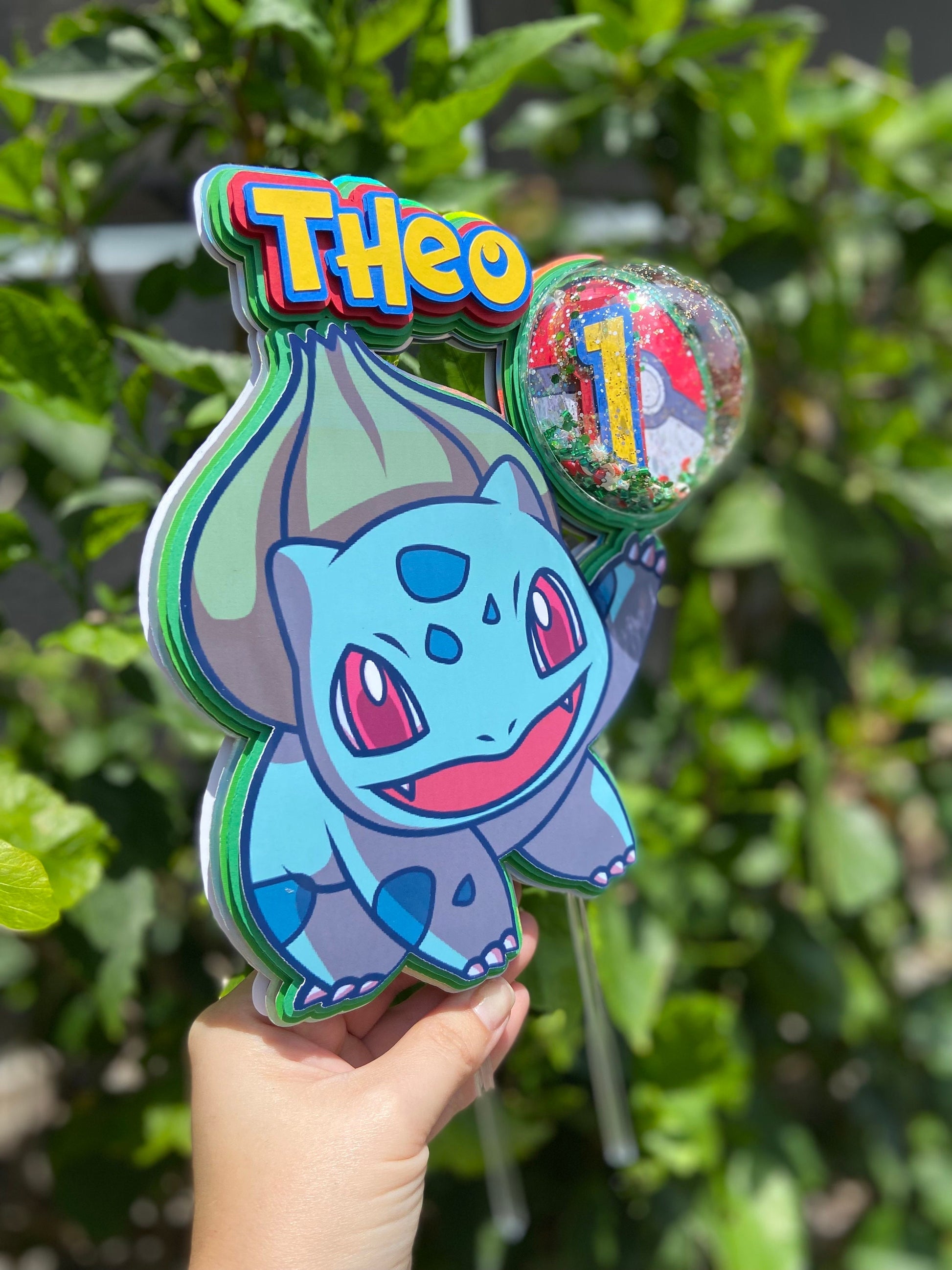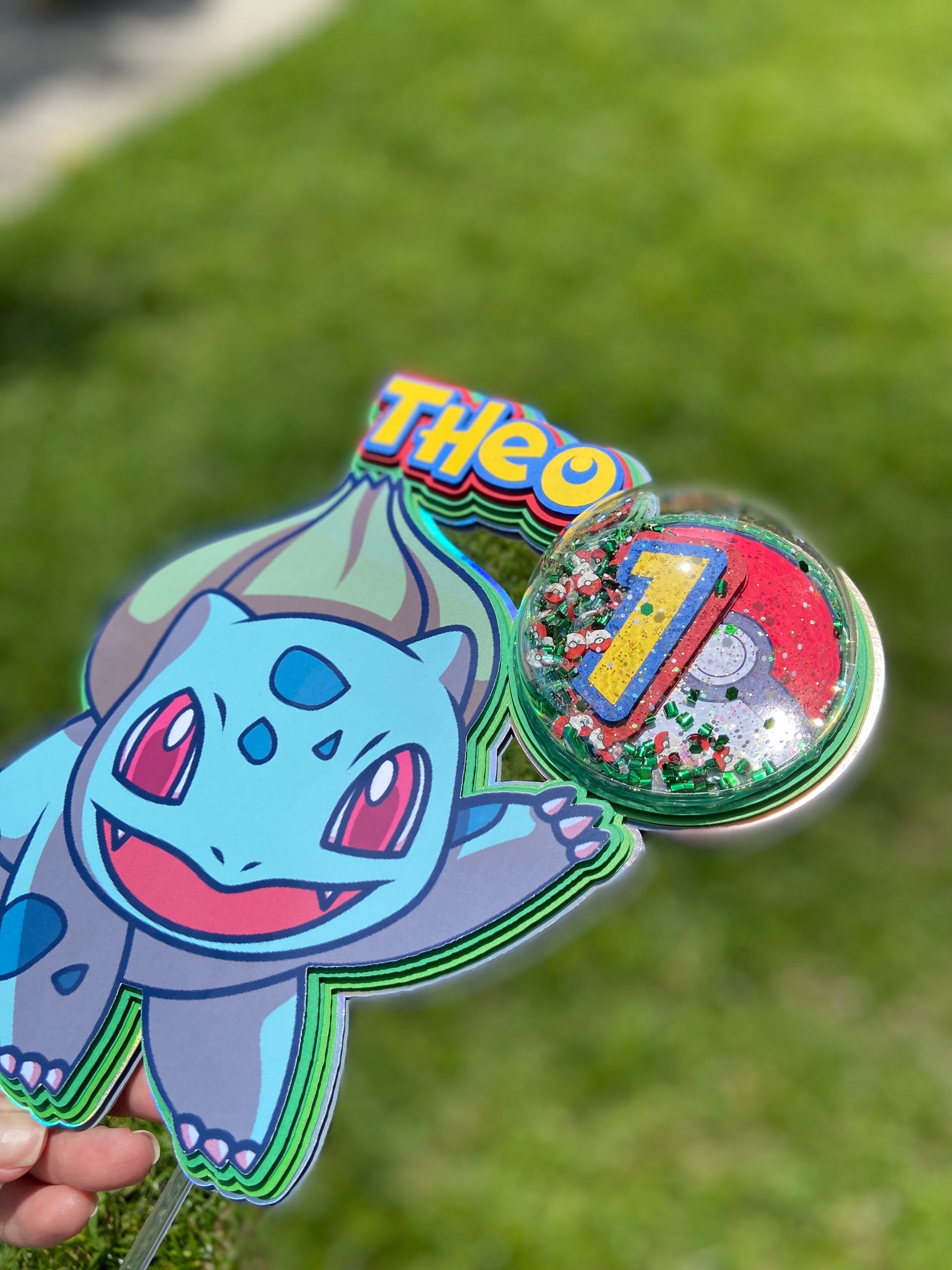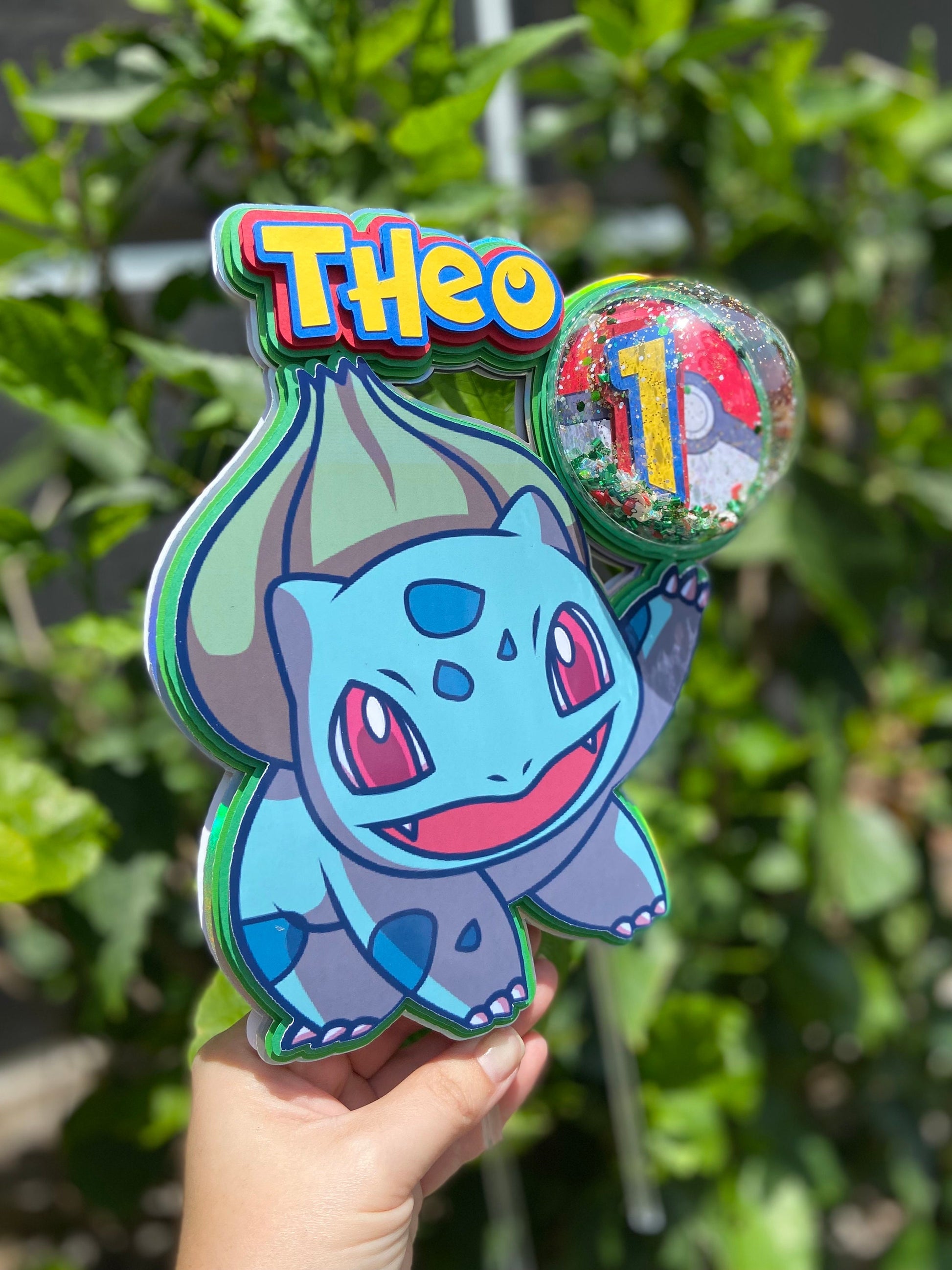 This is a Bulbasaur inspired shaker cake topper. Shaker topper? What is that? Well if you look where the age # is placed you will see a clear dome with small poke balls and confetti making it a shaker topper. Besides being a shaker topper, this cake topper is made with multiple layers to give it a 3D effect and POP!