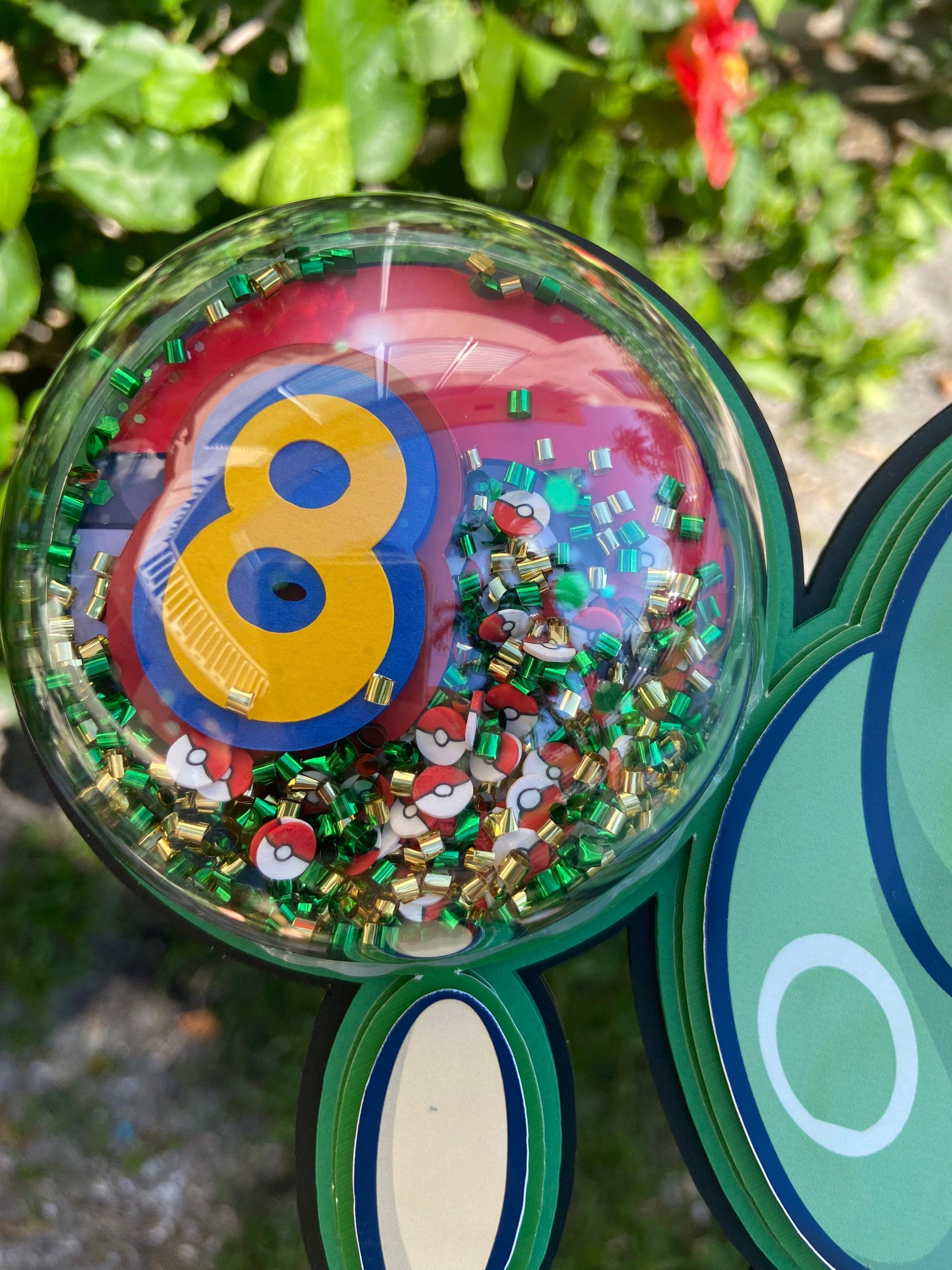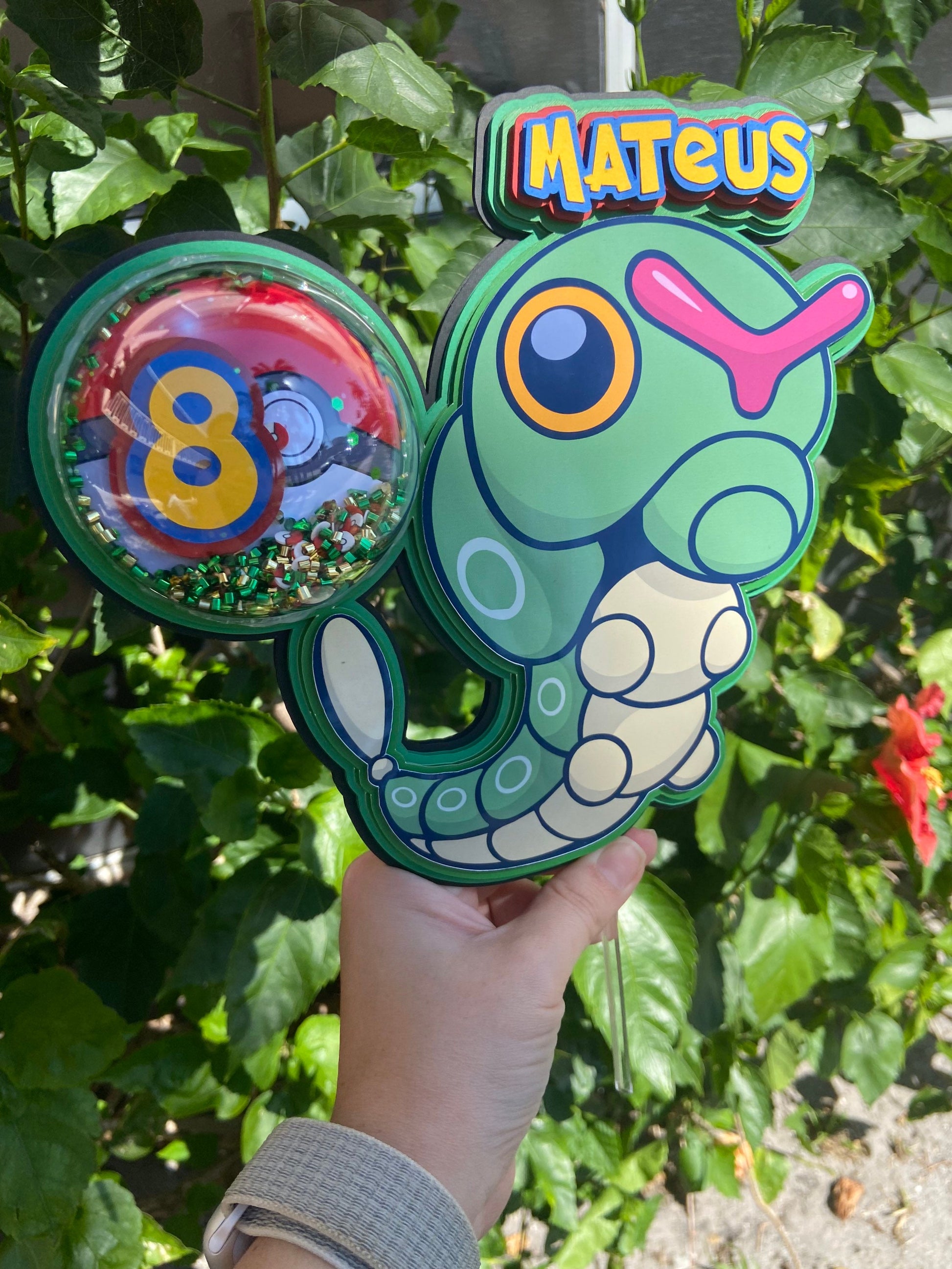 This is a Caterpie inspired shaker cake topper. Shaker topper? What is that? Well if you look where the age # is placed you will see a clear dome with small poke balls and confetti making it a shaker topper. Besides being a shaker topper, this cake topper is made with multiple layers to give it a 3D effect and POP!
