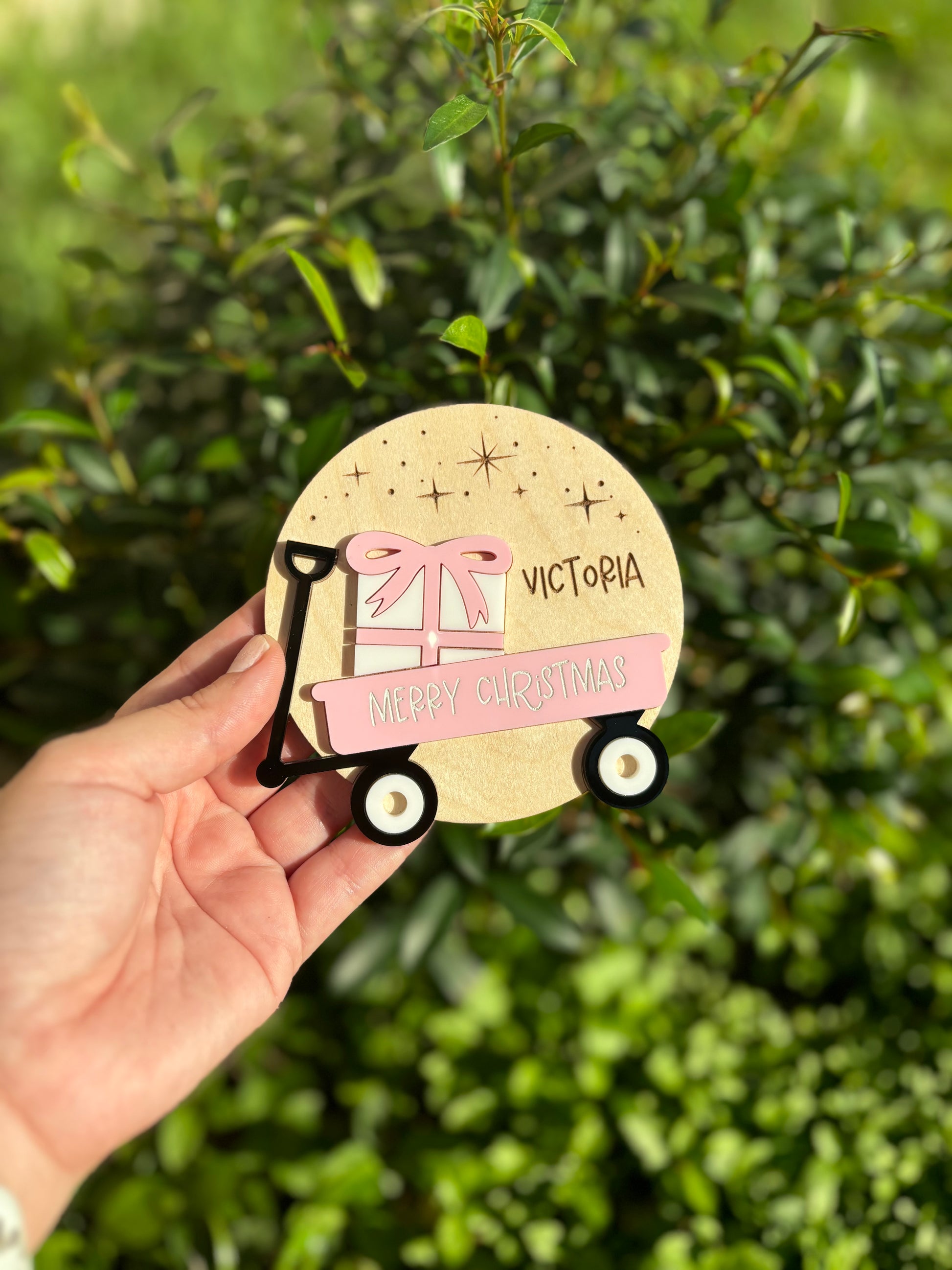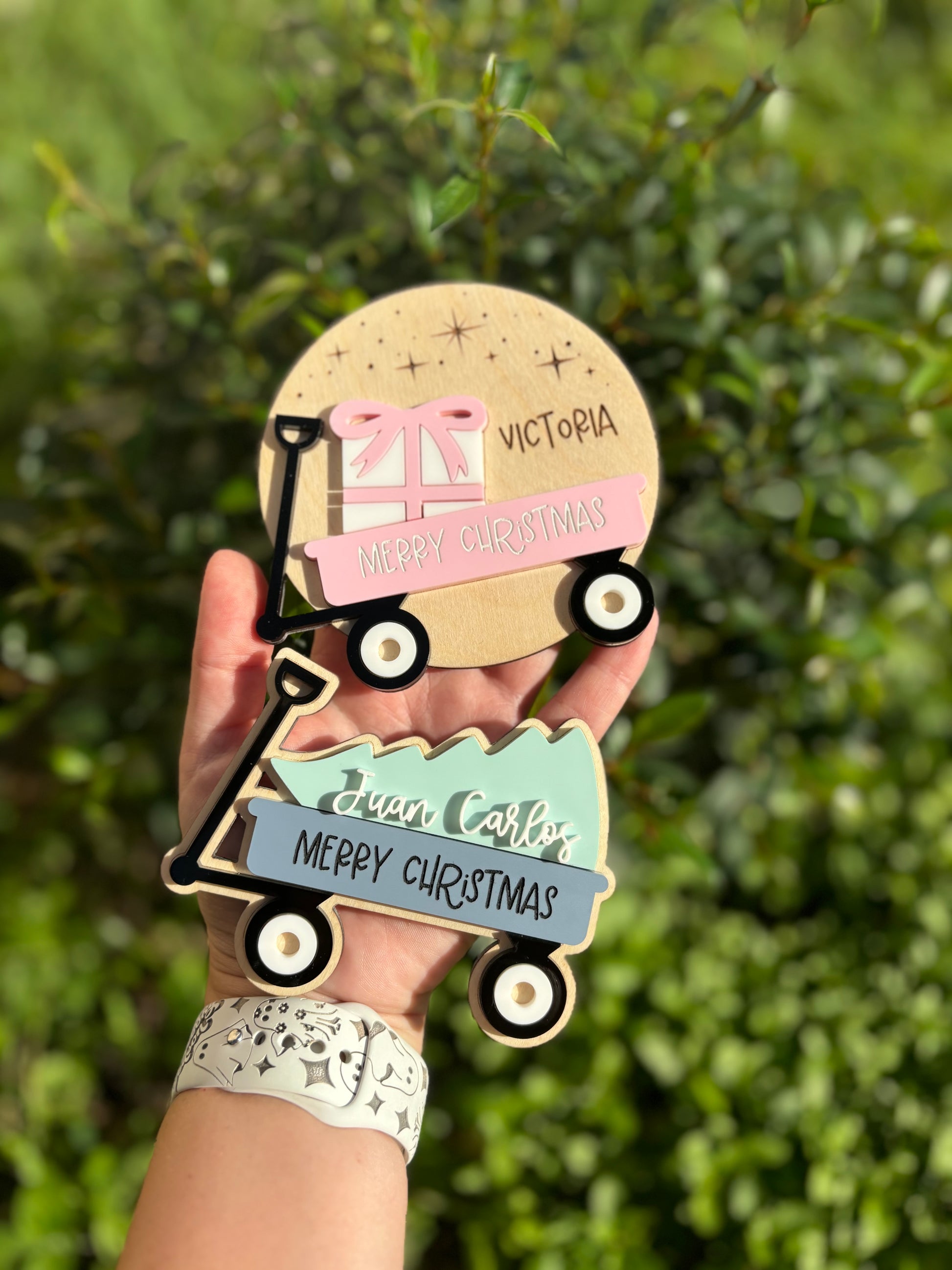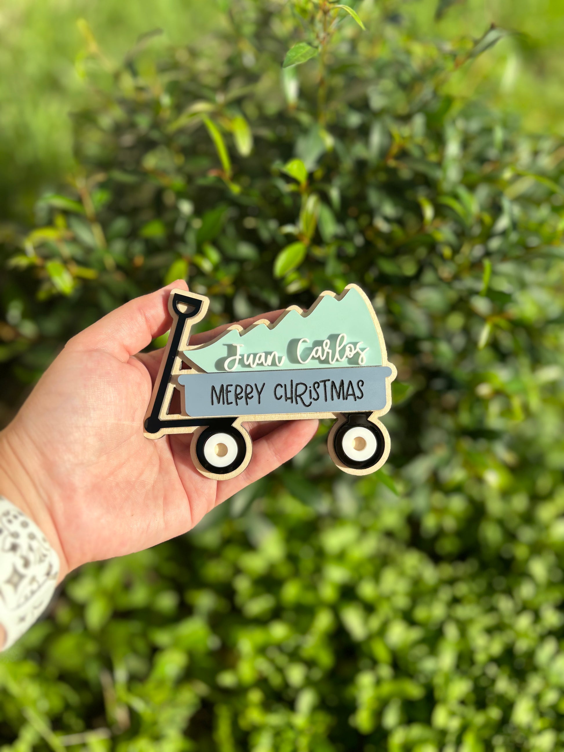 These personalized wagon Christmas ornaments are a great way to add a personal touch to your Christmas tree. The wagon design is cute and adds a festive touch to your tree. You can choose from the Christmas present wagon or the Christmas tree wagon colors. The colors are as shown above.
