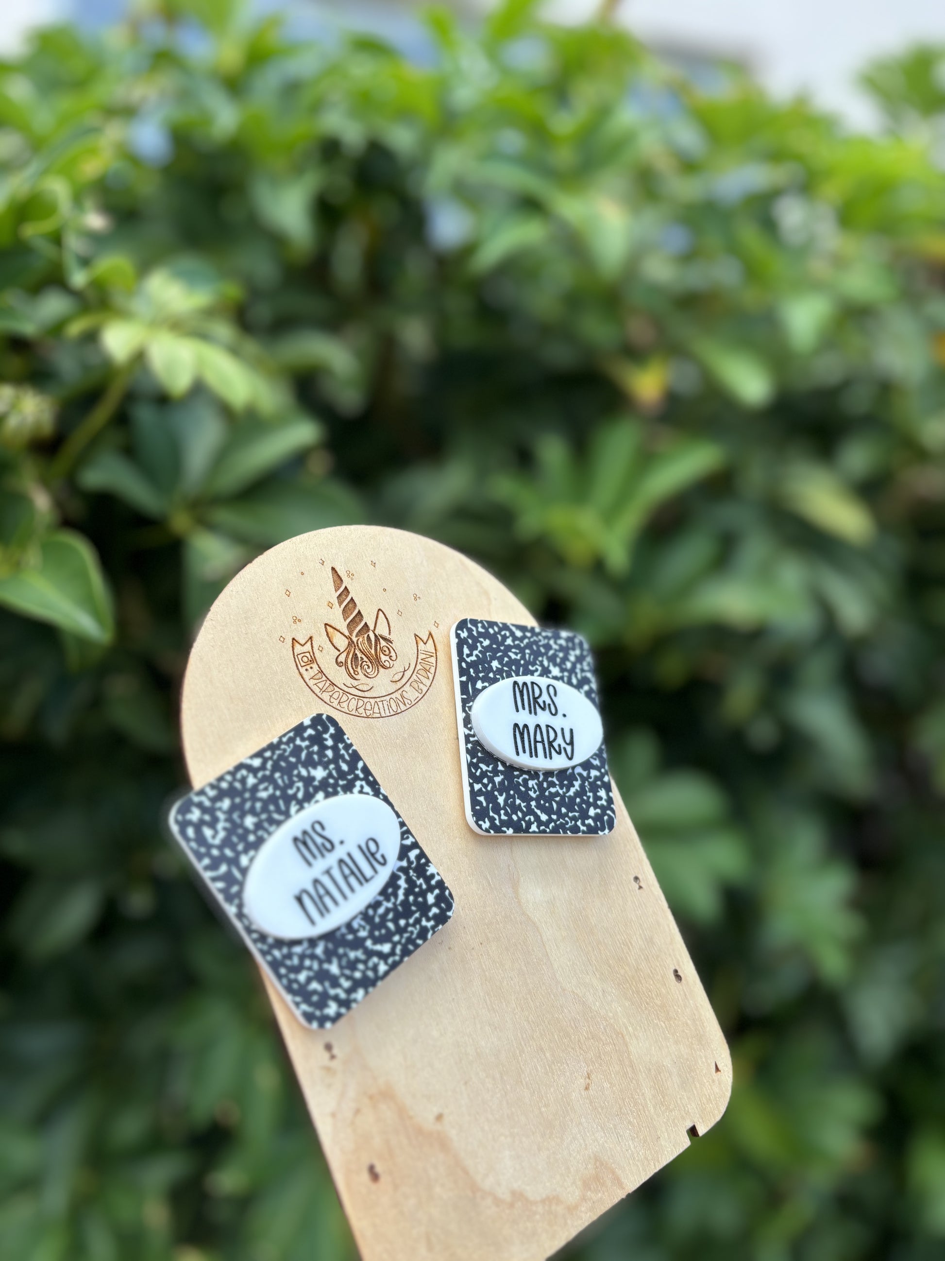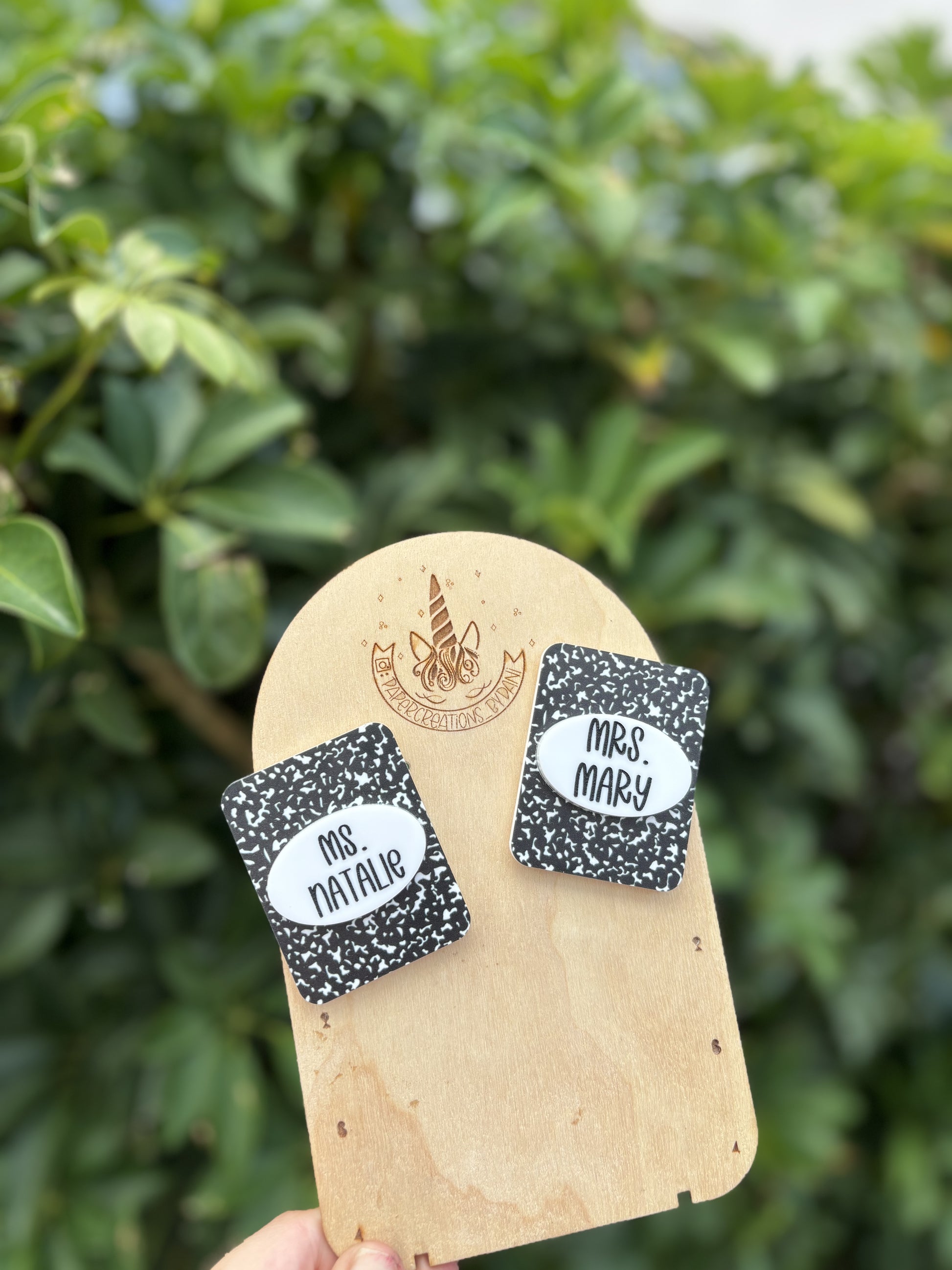 Looking for an exciting way to display your name as a teacher? Look no further than our Personalized Composition Book Teacher Badge! This double-layered acrylic badge is not only adorable but also incredibly lightweight, making it easy to wear all day long. Name is engraved and painted. Please select your paint color.