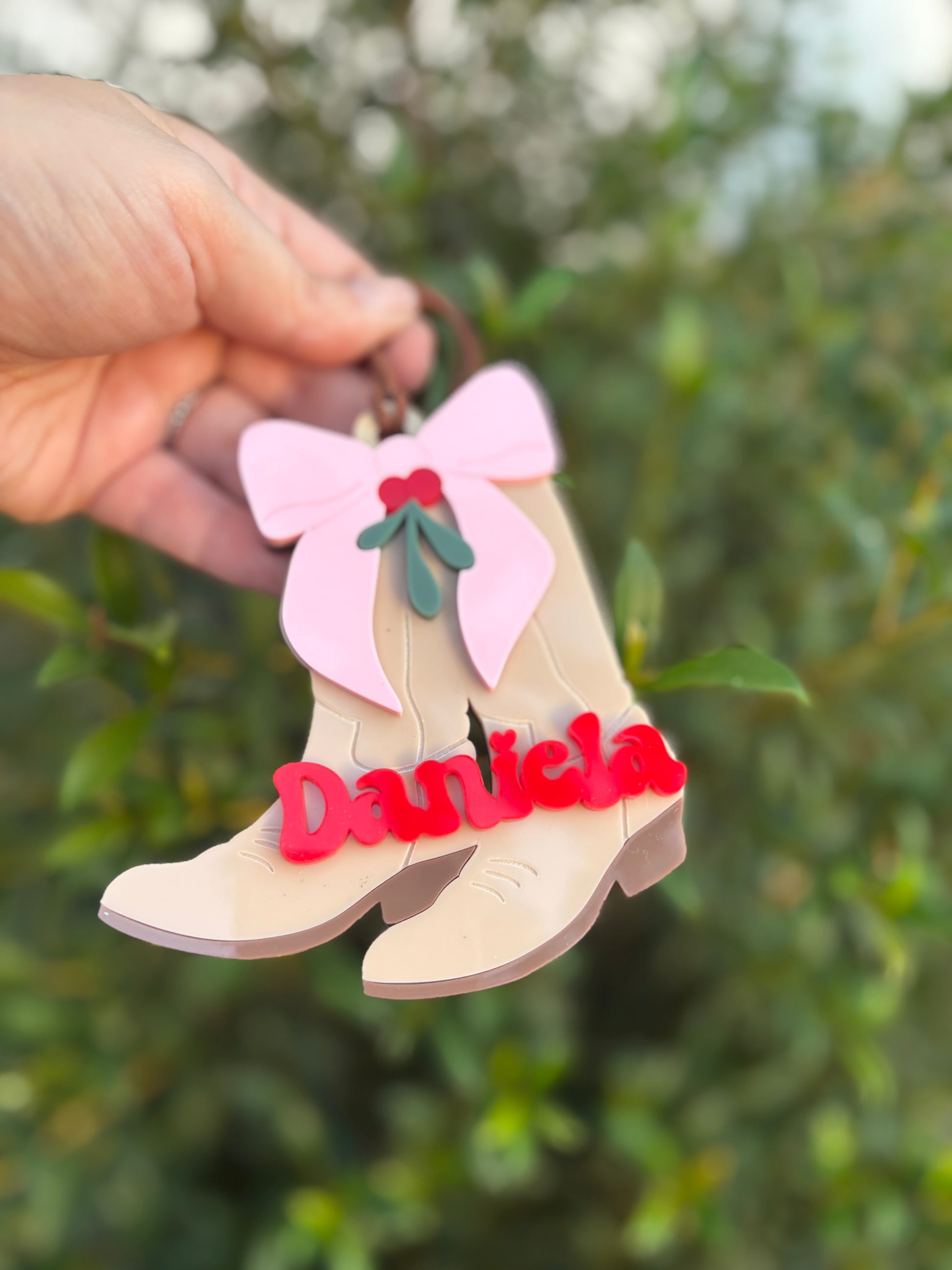 Add a little western charm to your Christmas tree this year! This adorable cowgirl boots ornament features layered acrylic details with a pink bow, holly berries, and your custom name in bold red lettering. Perfect for any cowgirl at heart who loves a mix of rustic and girly!