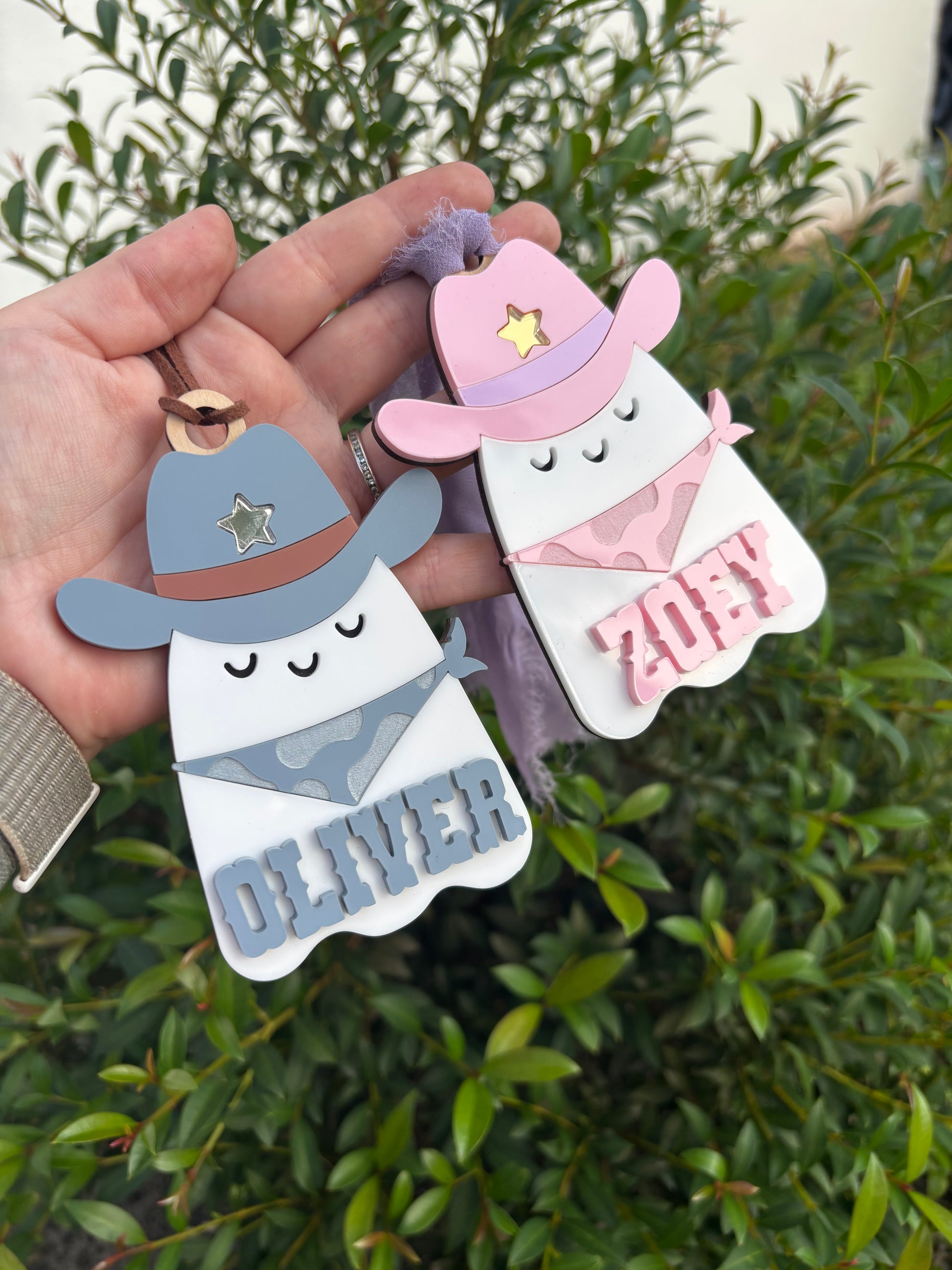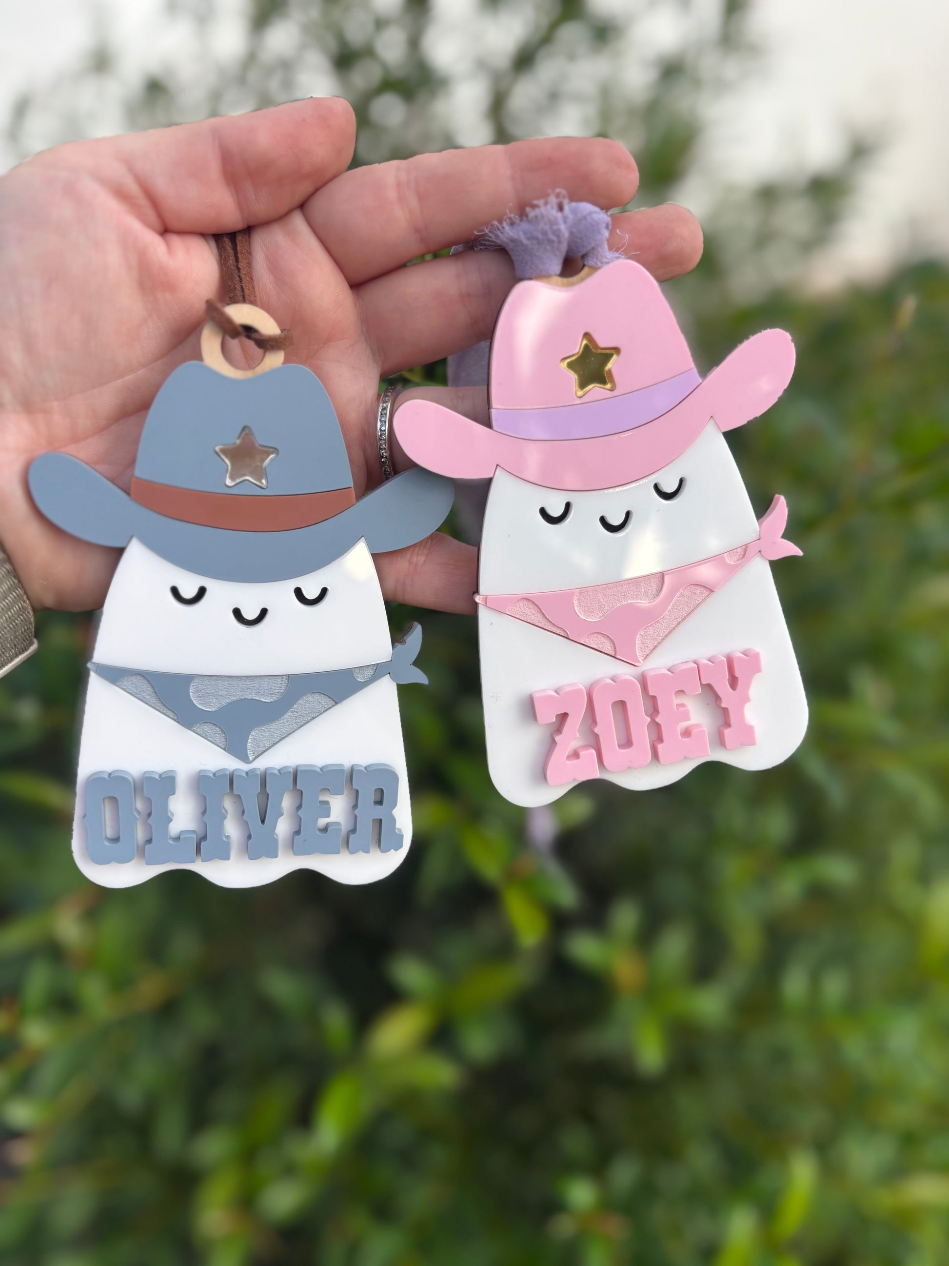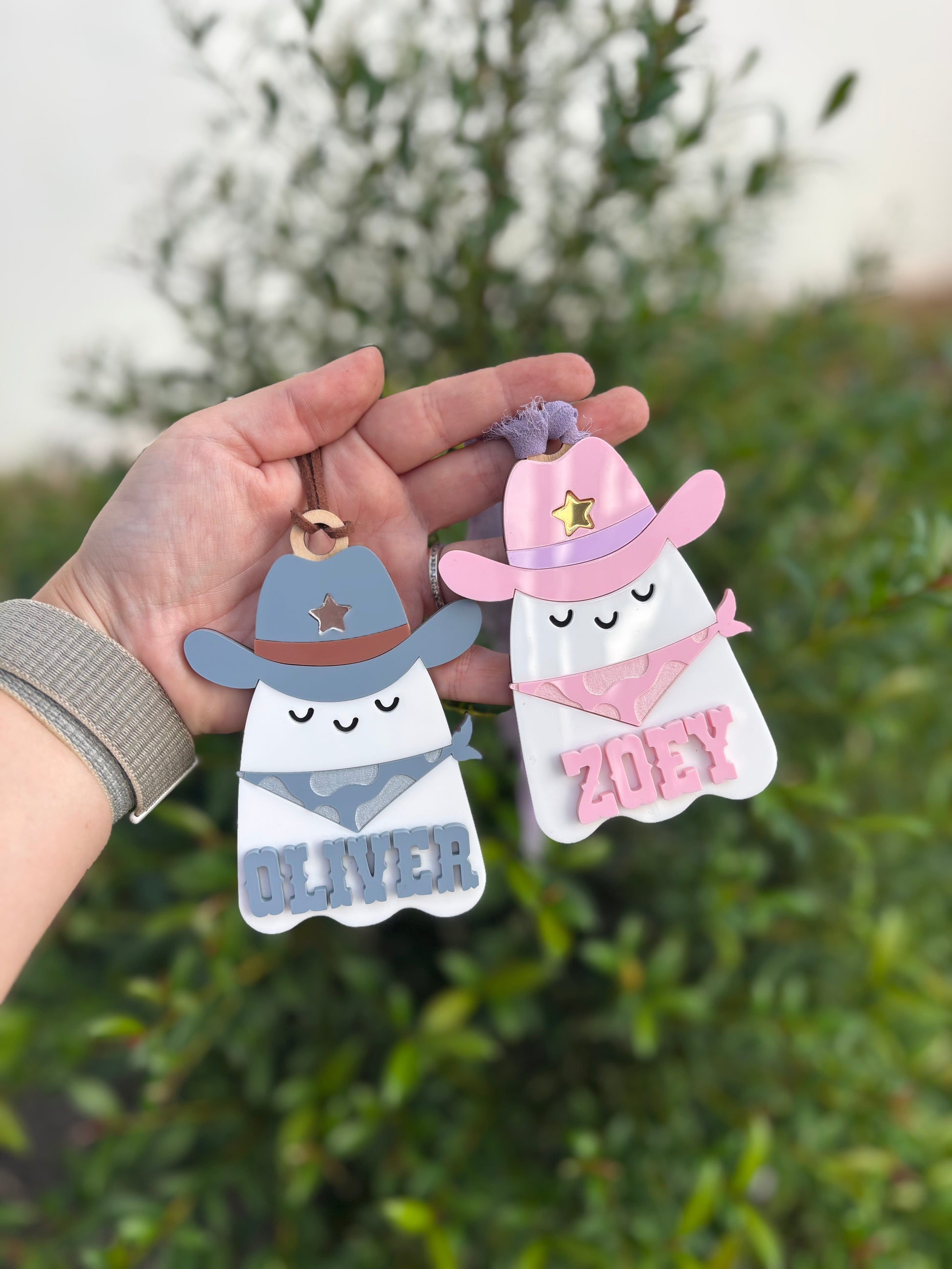 Personalized Halloween Basket Tags – Make your child’s trick-or-treat bucket extra special with these adorable ghost cowboy name tags! Each custom tag features a cute ghost with a cowboy hat and bandana, personalized with your child’s name in bold letters.