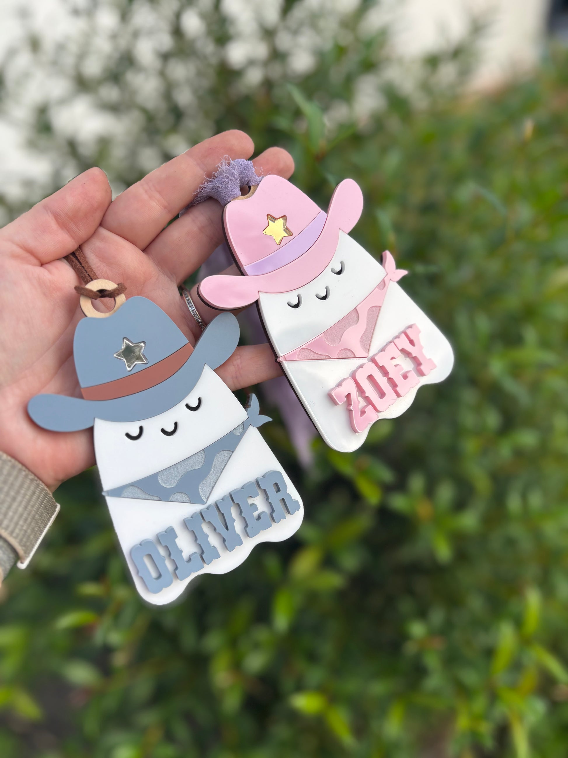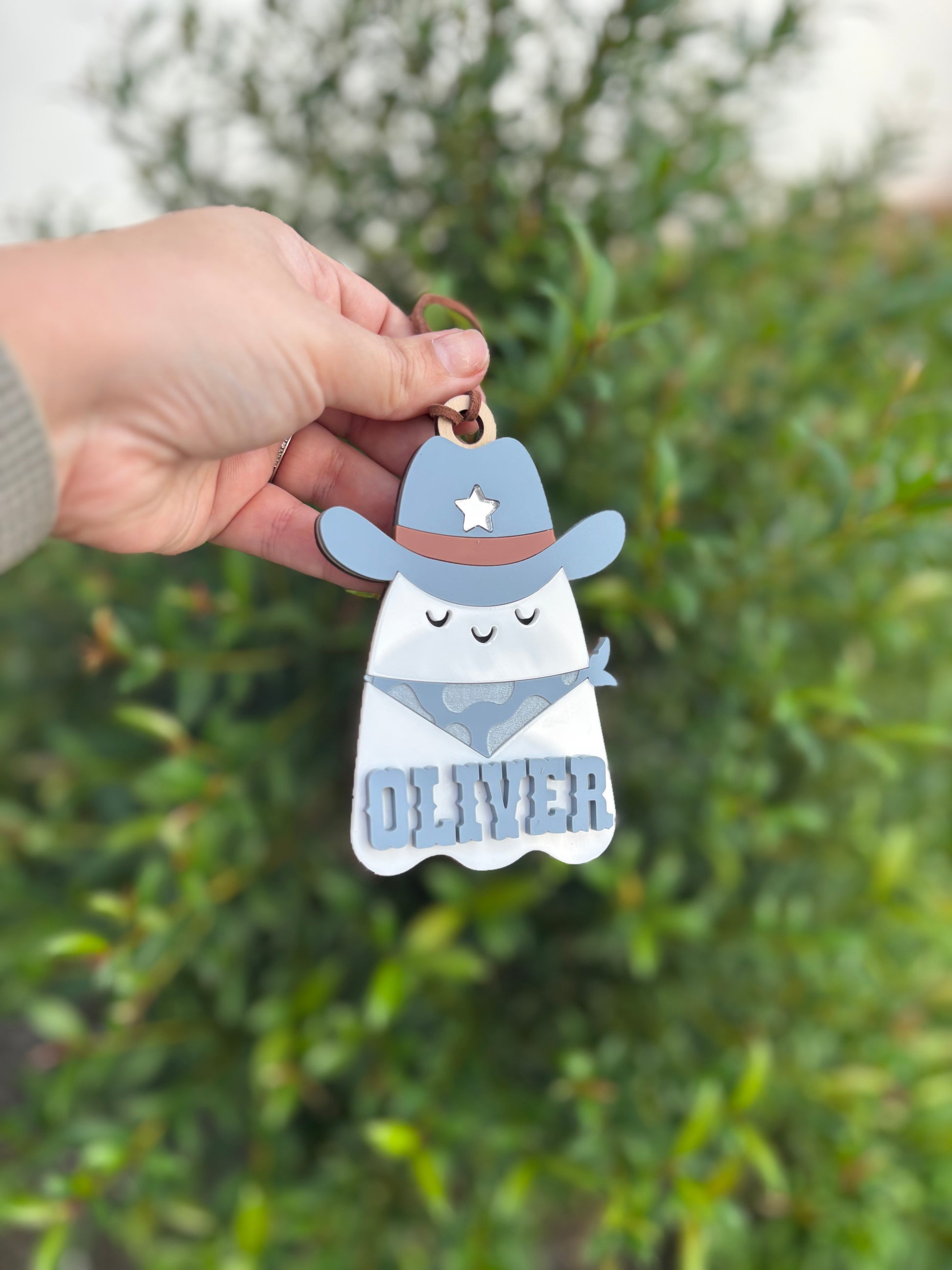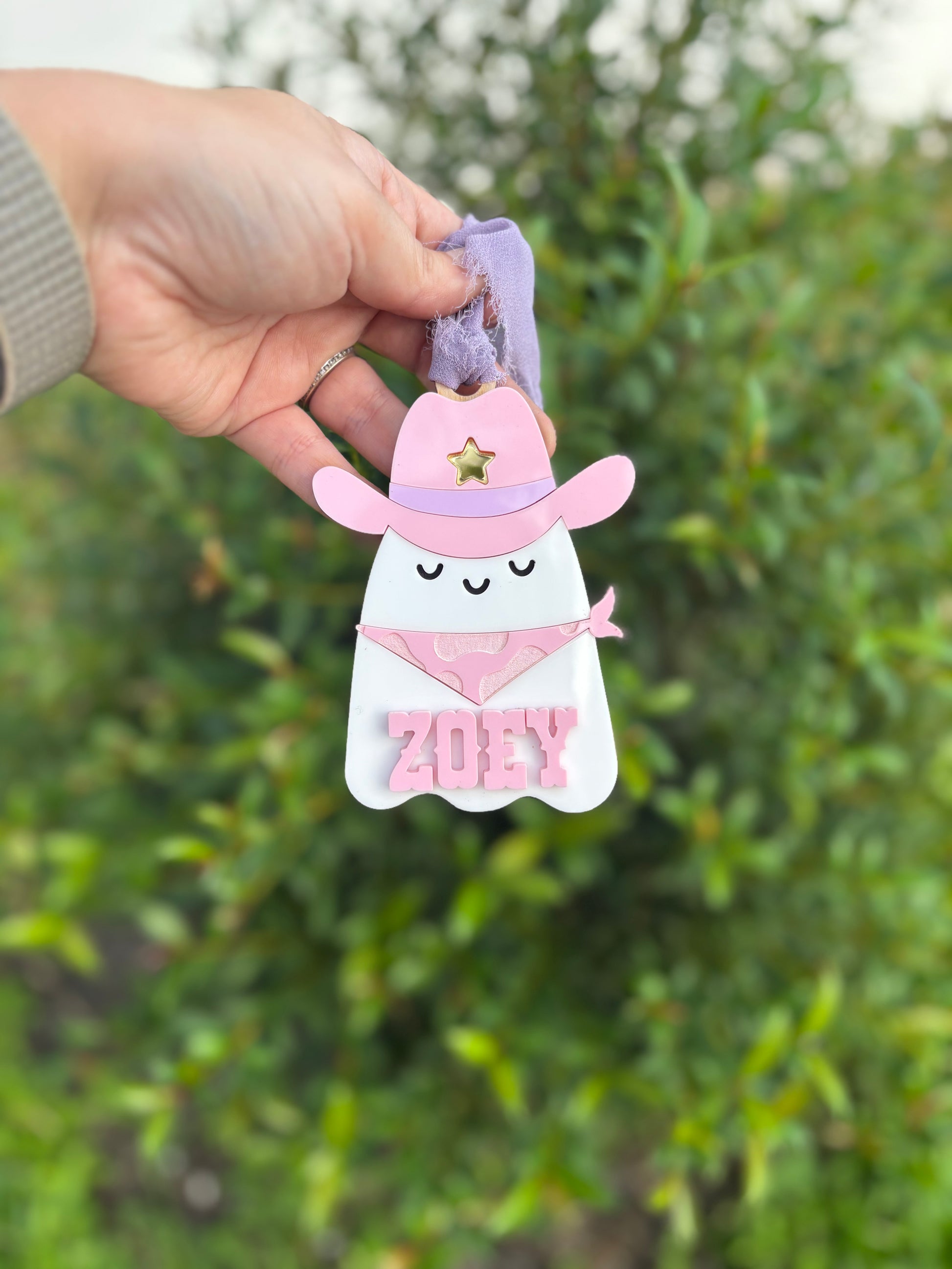 Personalized Halloween Basket Tags – Make your child’s trick-or-treat bucket extra special with these adorable ghost cowboy name tags! Each custom tag features a cute ghost with a cowboy hat and bandana, personalized with your child’s name in bold letters.