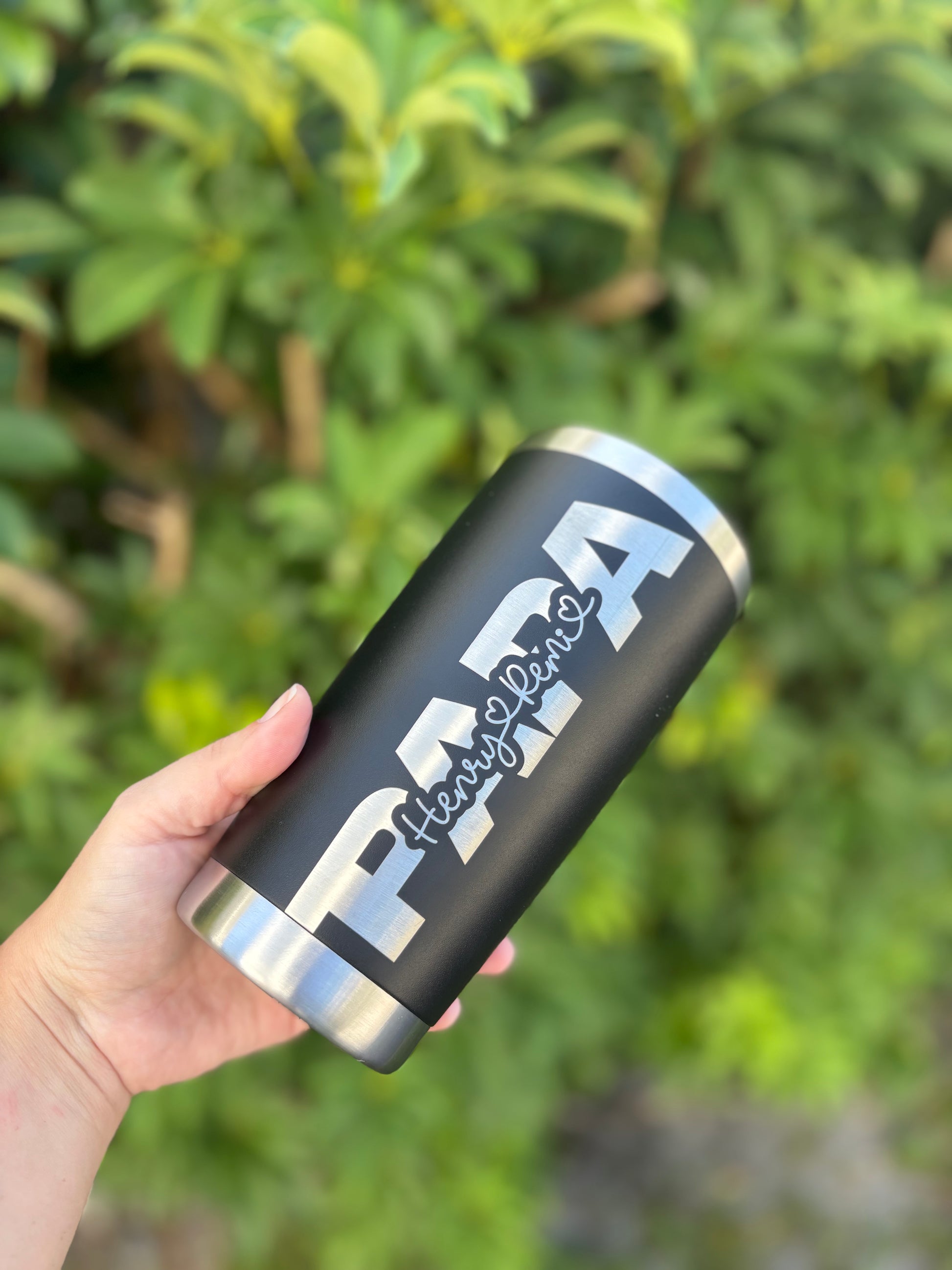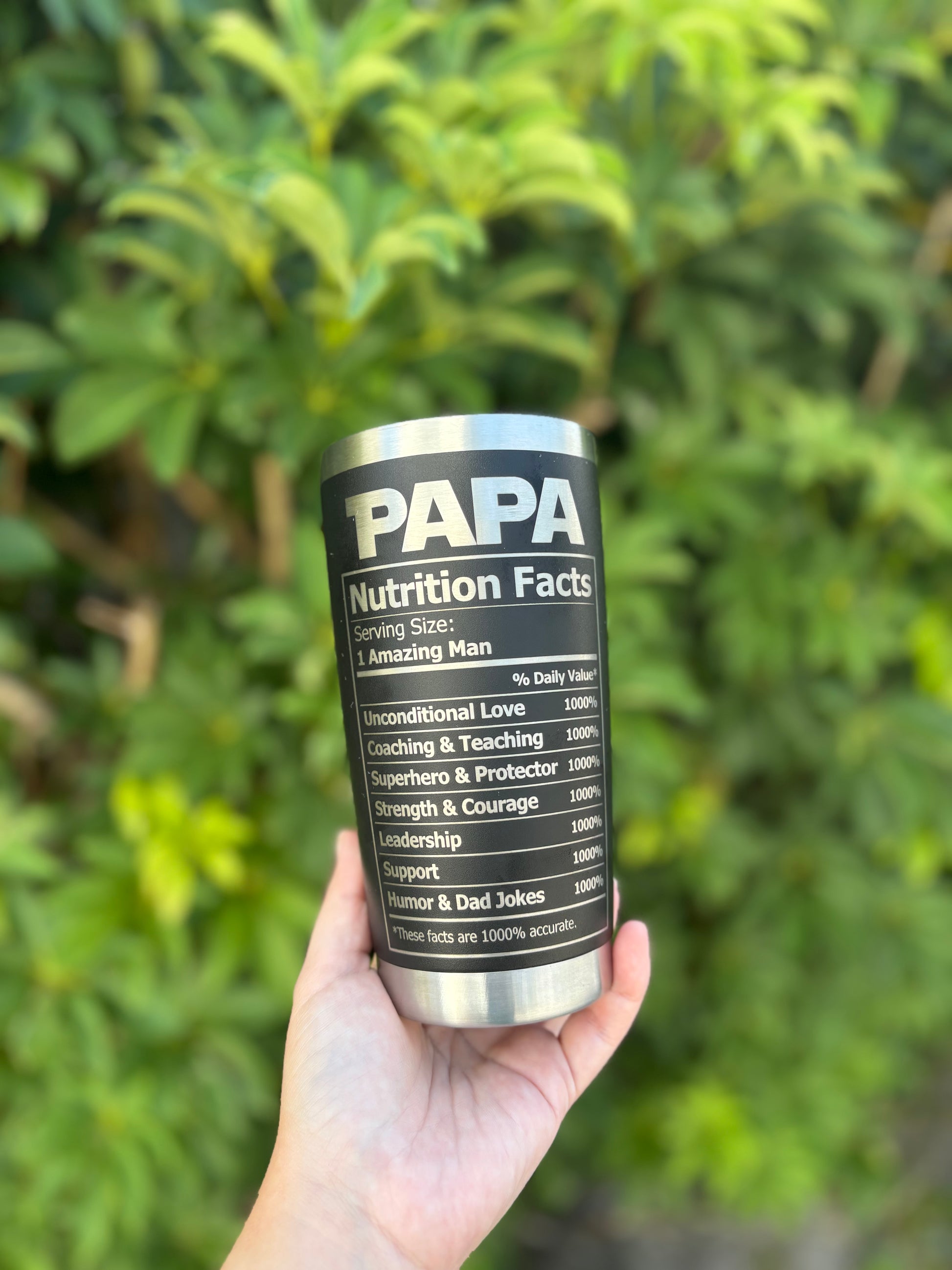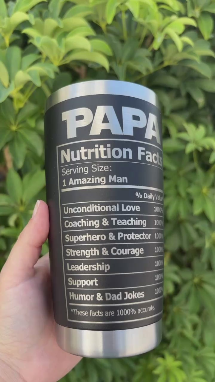 Whether you’re looking for a gift for Dad,grandpa, papa… these 20-ounce tumblers are perfect. They are laser engraved with Nutrition facts and adding a personal touch with the children’s name.
