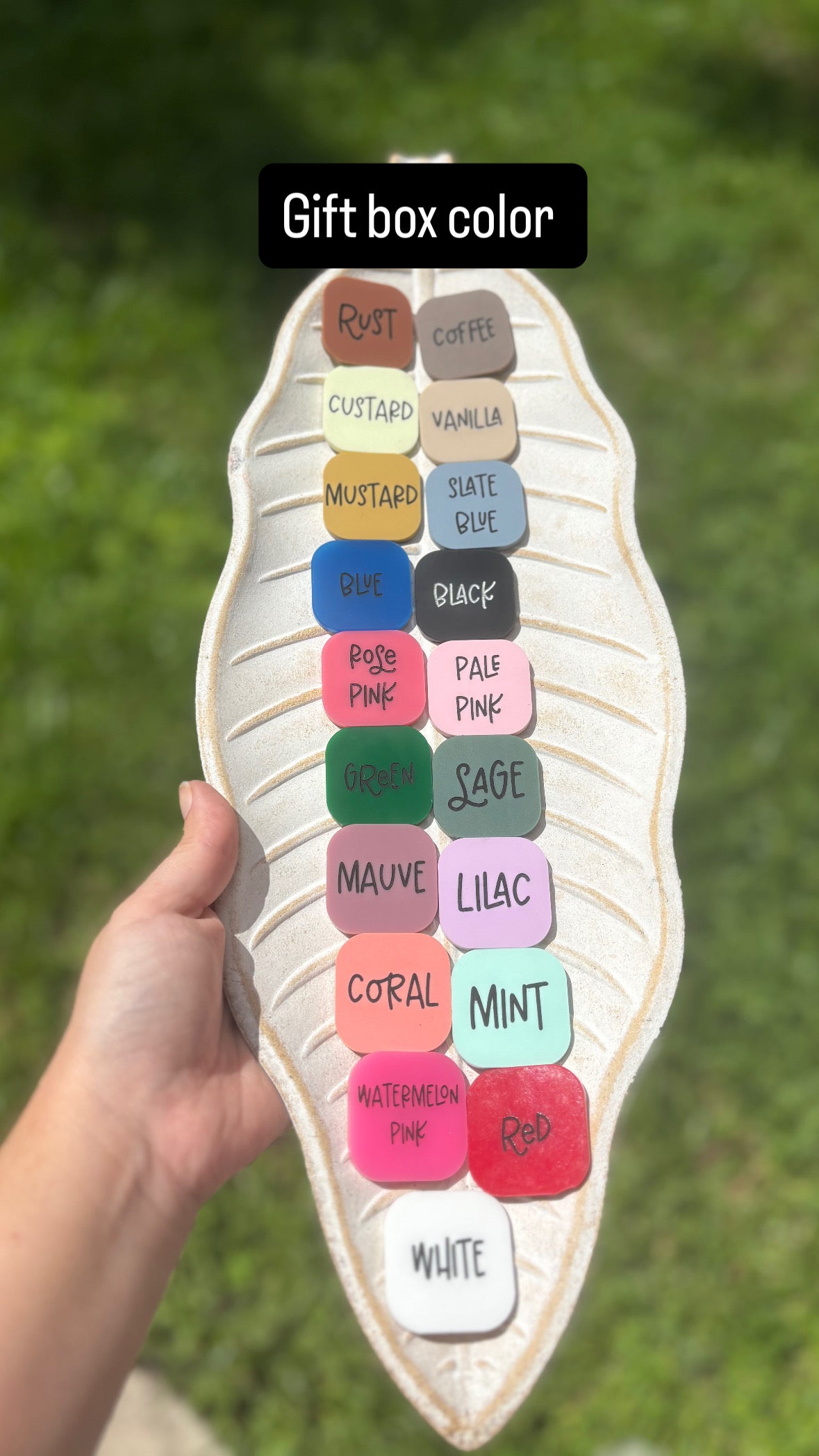 Please select the color of acrylic for the gift boxes (See picture for color options)
