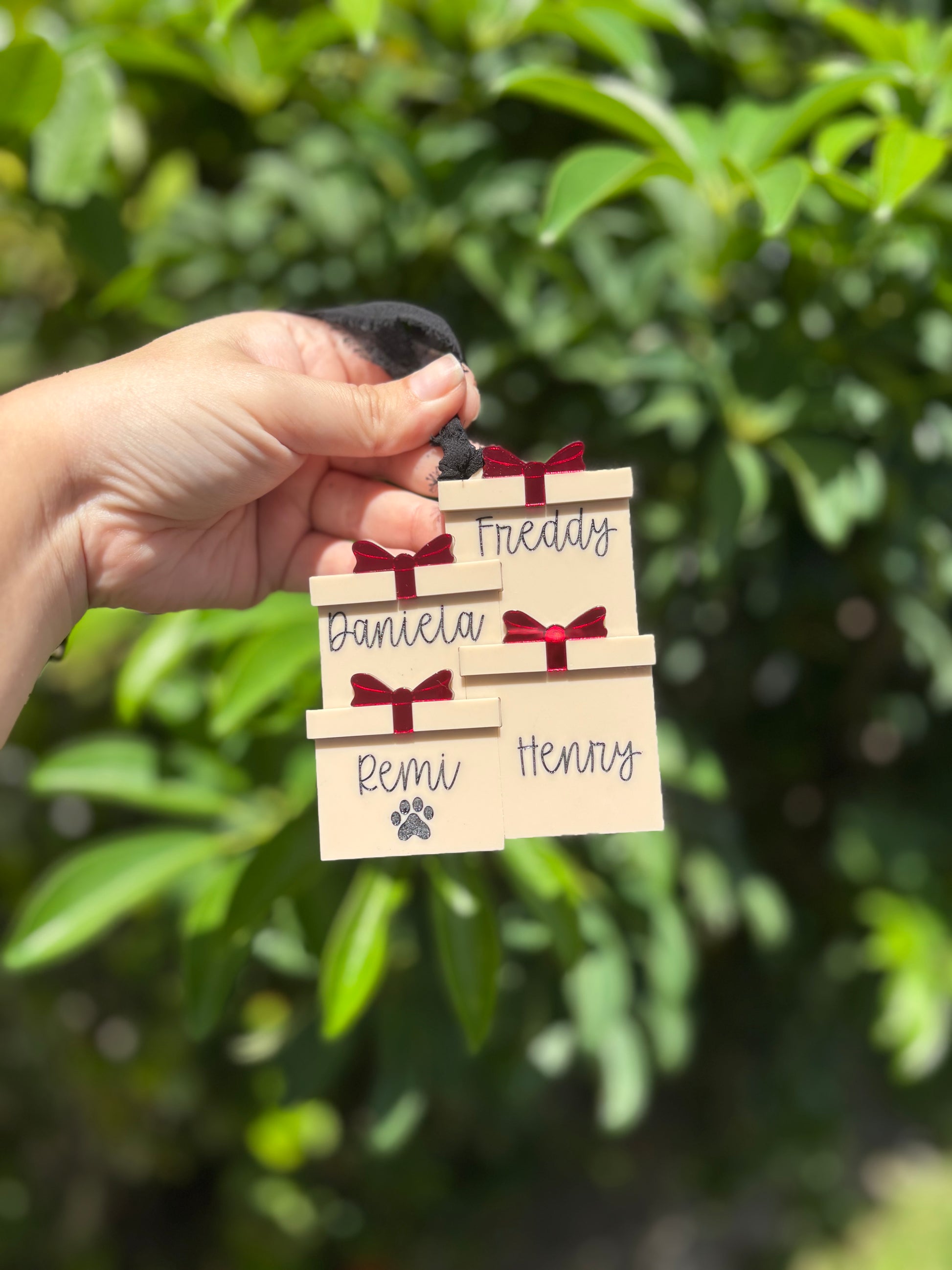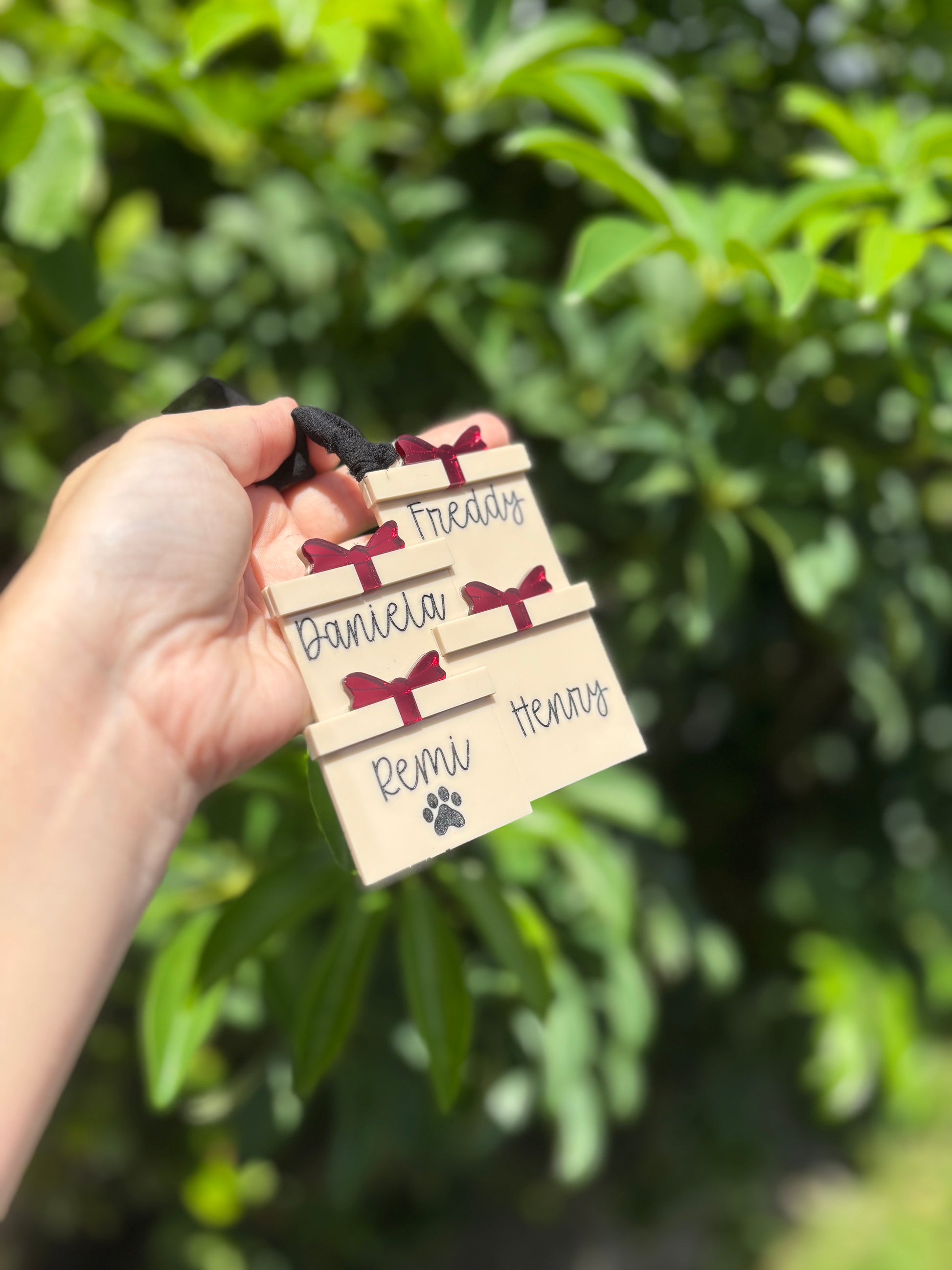 Celebrate your loved ones (including the furry ones!) with this charming personalized family ornament. Each piece is crafted in the shape of a gift box, adorned with a mirror acrylic bow and custom name hand-lettered in a stylish script. Names are engraved and painted in black. Unless you choose black acrylic, then the it will be painted white.
