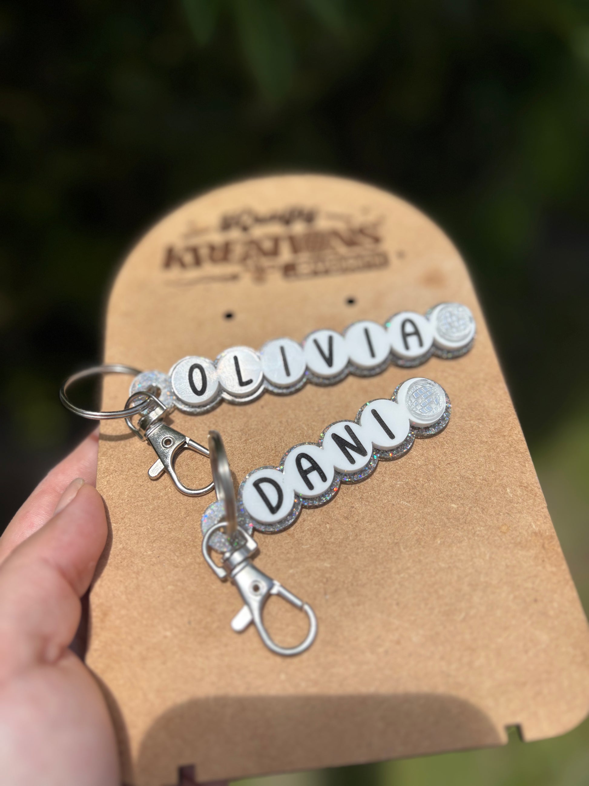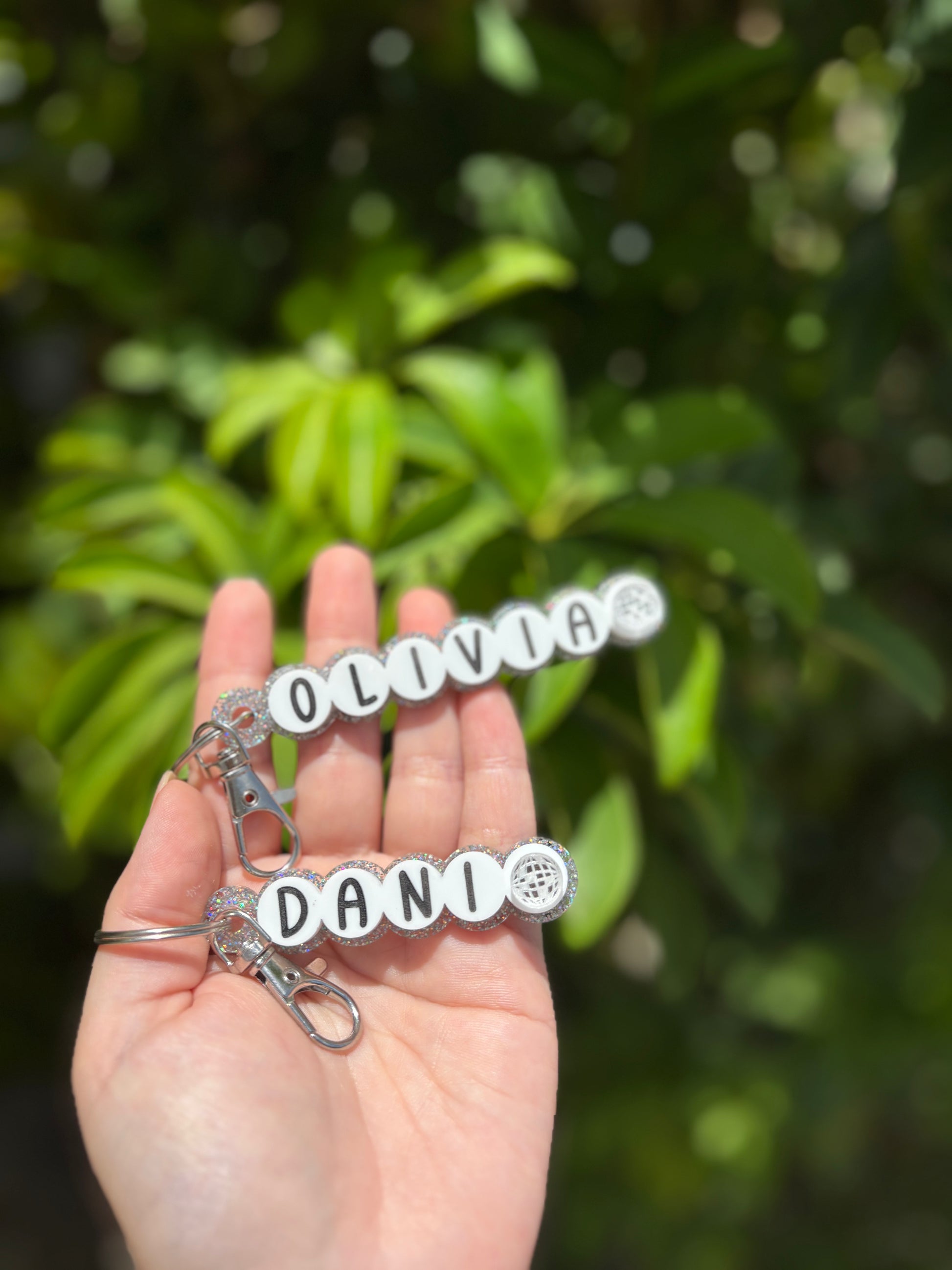 Celebrate your favorite names and bonds with these adorable friendship bracelet-inspired keychains! Designed to mimic the nostalgic charm of classic letter bead bracelets, each keychain features custom names on a glittery acrylic base—bringing sparkle, sentiment, and style together in one perfect accessory.