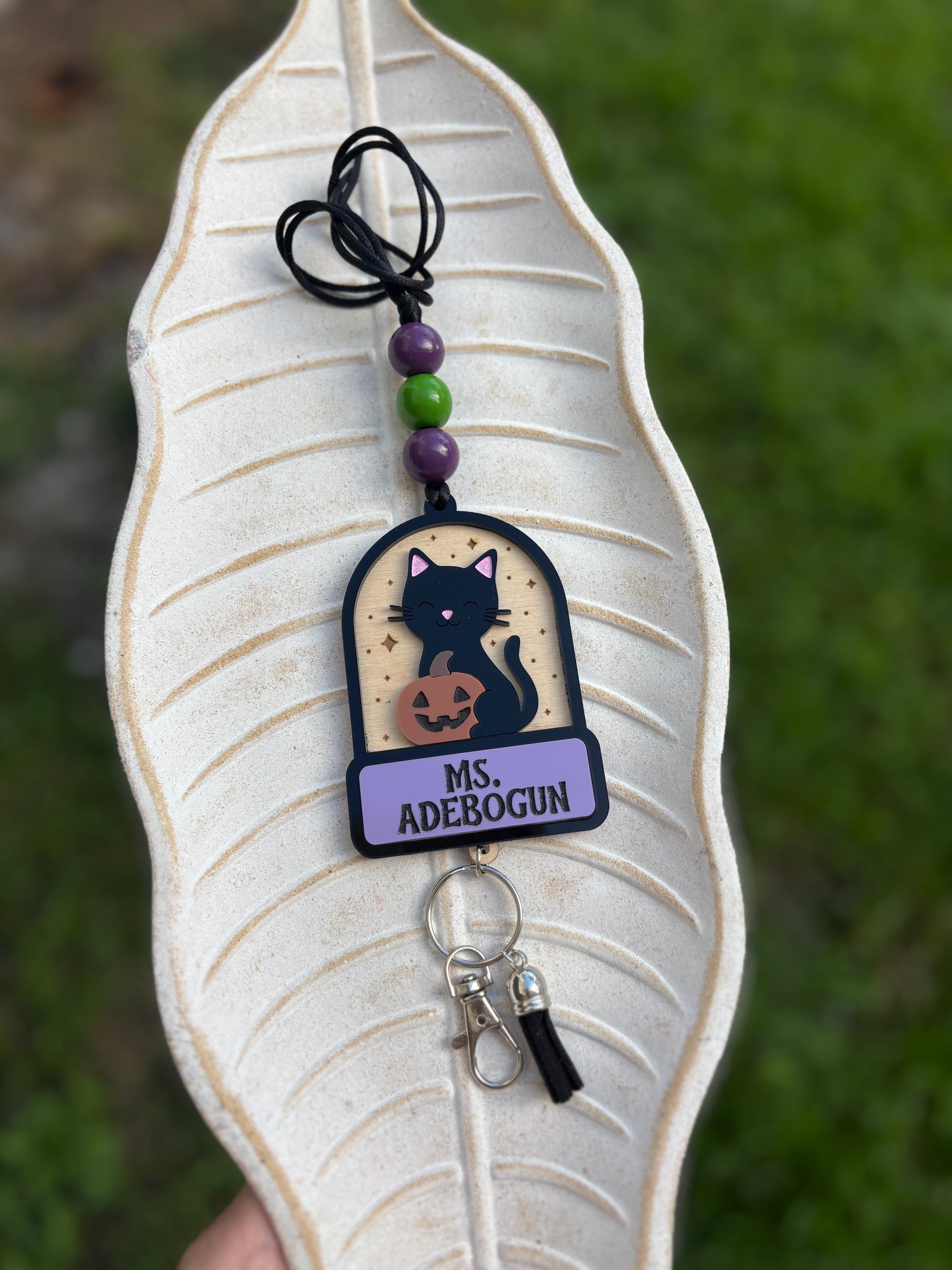 Add a little spooky fun to your teacher style with this personalized Halloween lanyard! a black cat holding a pumpkin design, colorful Halloween beads, and a tassel charm, this lanyard is both festive and functional. Perfect for holding your keys, ID badge, or classroom essentials while showing off your Halloween spirit.