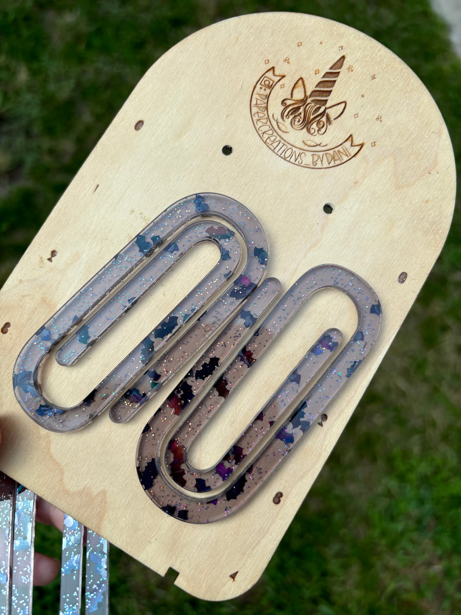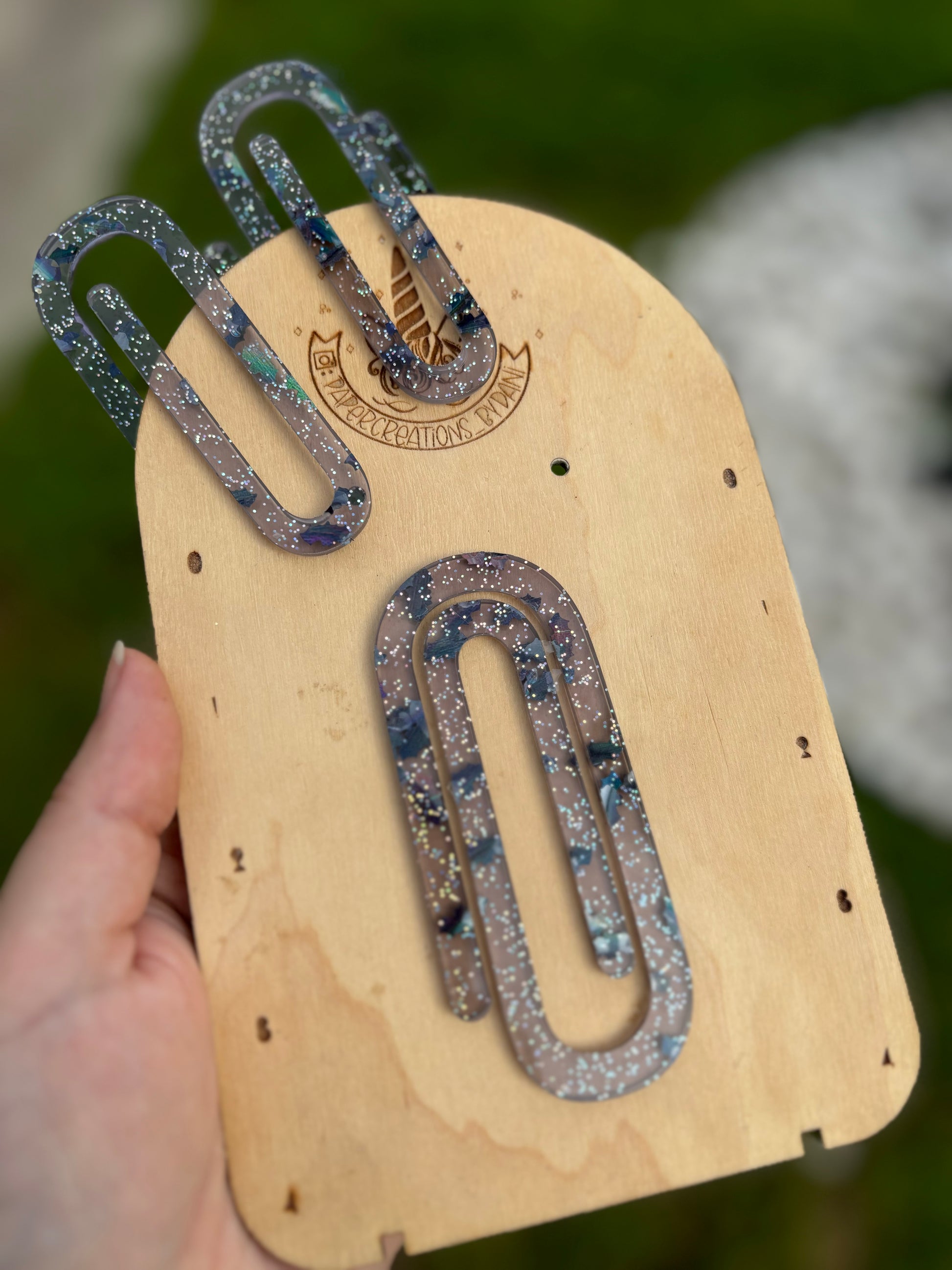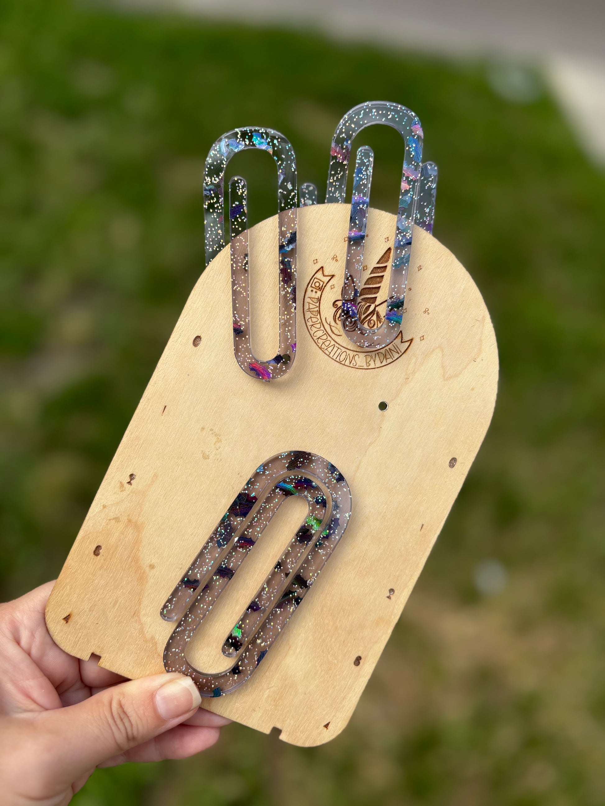 These paperclip bookmarks are a fun and practical addition to any book lover's collection. Made from 1/8 acrylic, they are both lightweight and durable, making them easy to carry around and less likely to break or bend. With a height of 3.5 inches, they are the perfect size to hold a good amount of pages without being too bulky or cumbersome. This is a transparent holographic bat glitter acrylic.