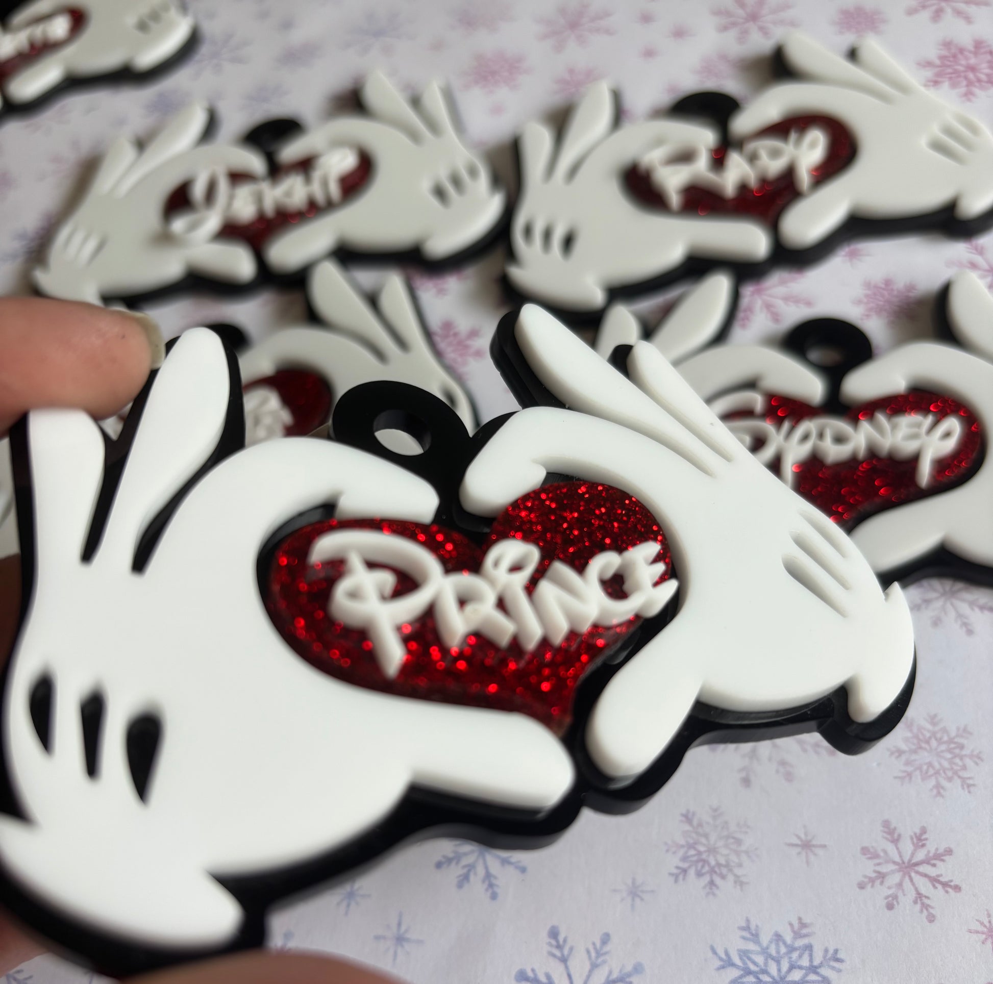 Layered heart mouse hands acrylic ornament. Measures 4 inches wide. Add name to personalize.