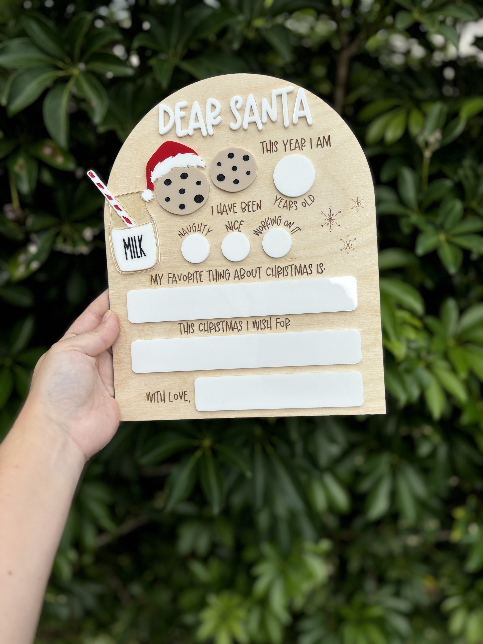 This birchwood sign is a fun and interactive way to involve children in the holiday season. The sign includes sections that can be filled in with a dry erase marker, allowing for customization and personalization. The sign is a dry erase letter to Santa, which can be used with multiple children and is perfect for those photo ops.