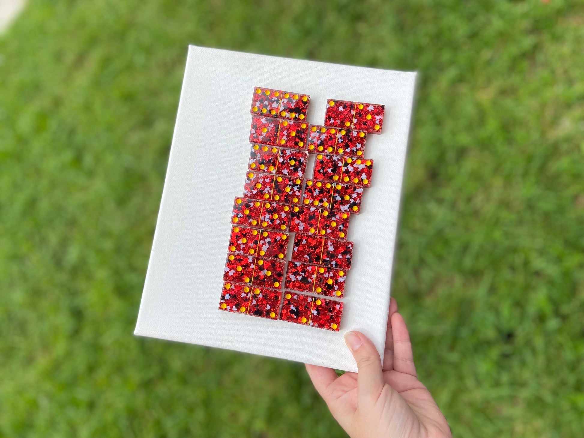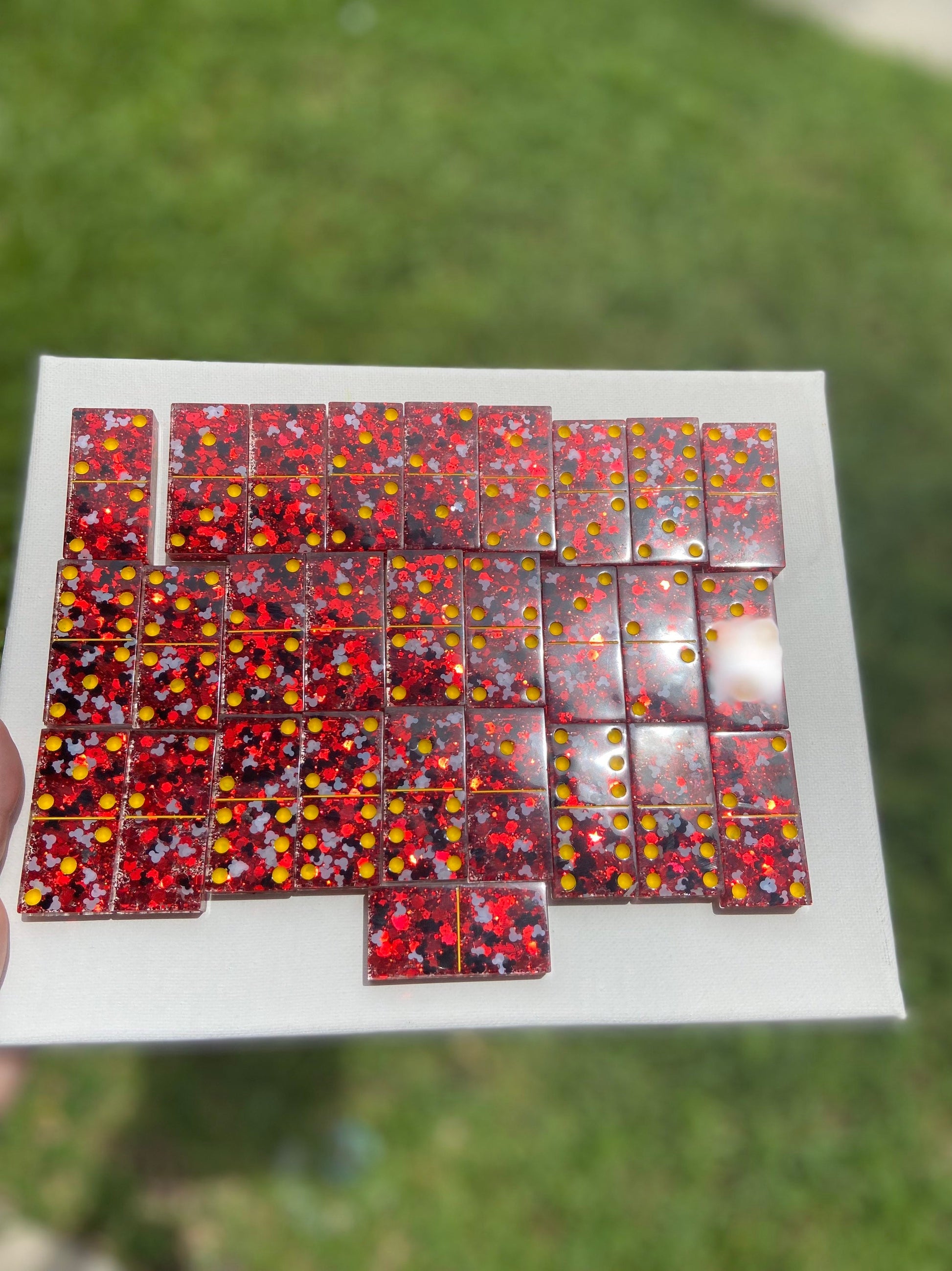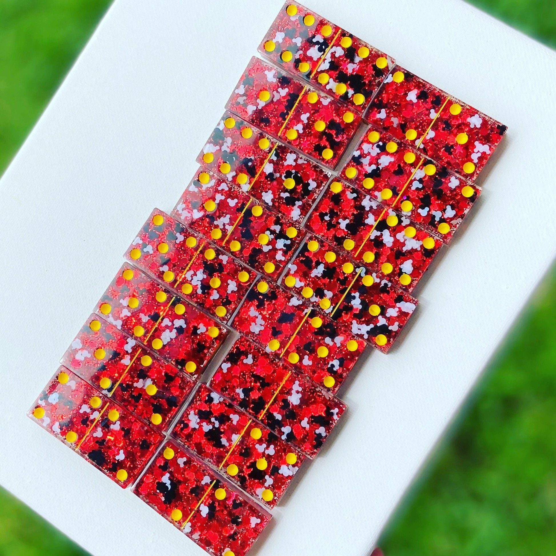 This listing is for a full set of 28 pieces (double 6) dominoes set. The dominos are red with black and white mickeys and the pips are painted by hand in the color yellow. Just like the iconic Mickey outfit.
