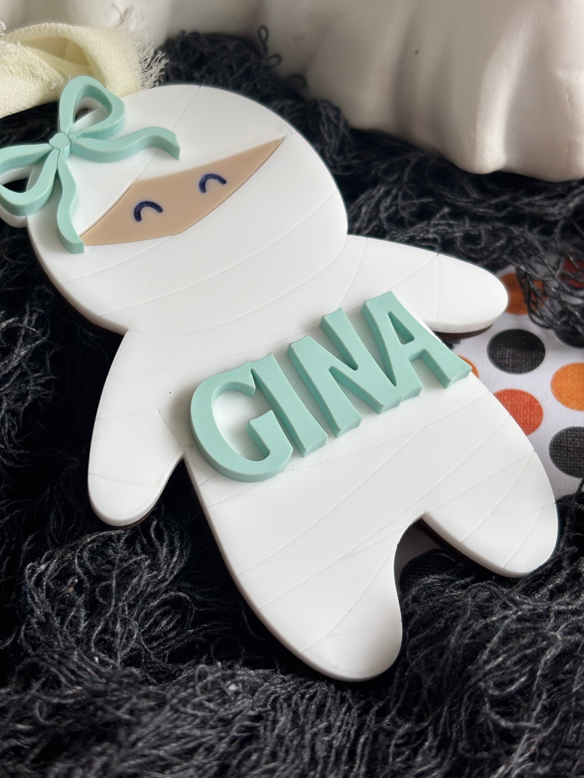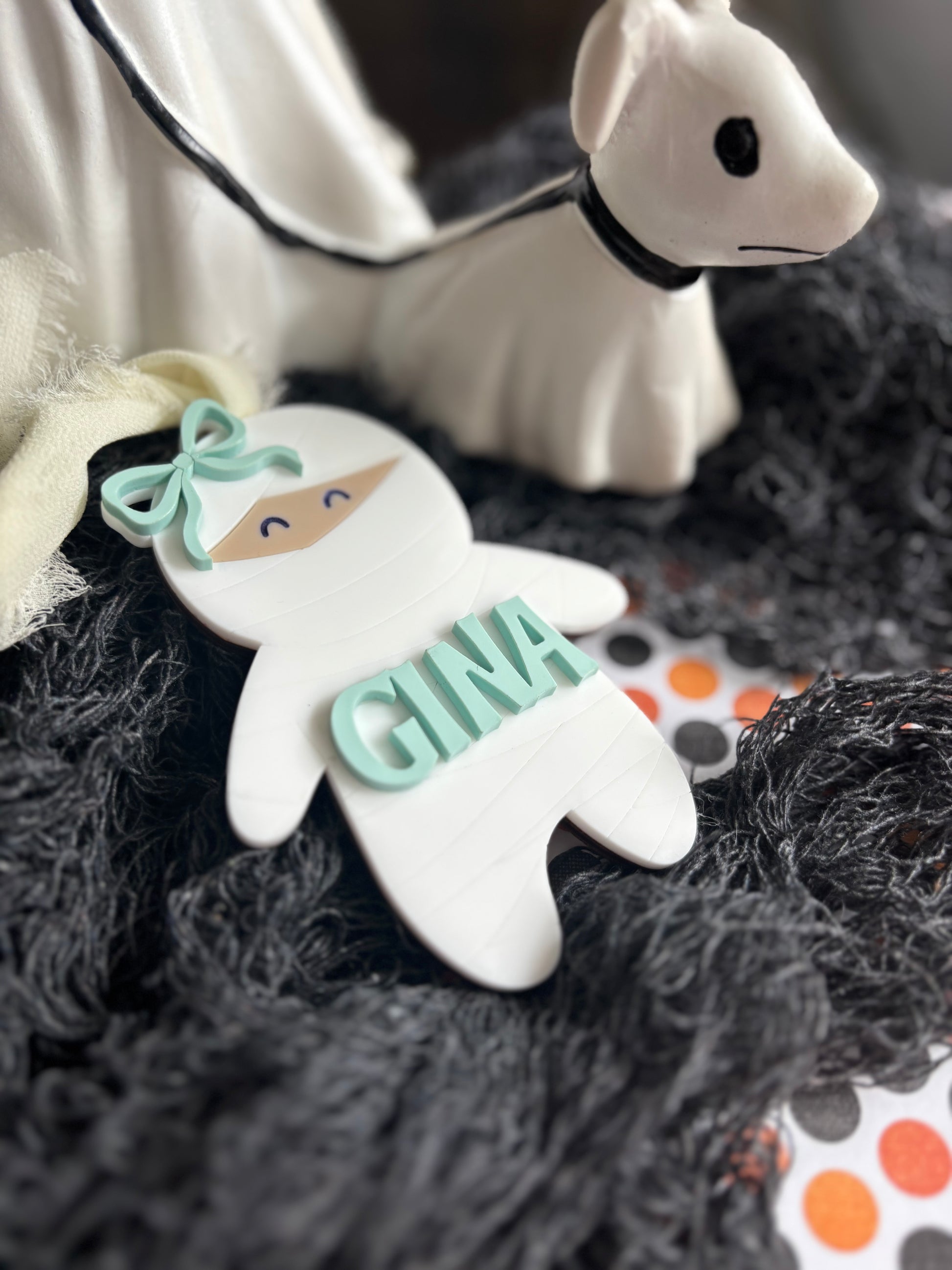 This adorable custom Halloween tag is made from layered acrylic, featuring a white mummy design with a playful bow and smiling eyes. Each tag is personalized with your child’s name in 3D letters, making it the perfect accessory for trick-or-treat bags, Halloween baskets, or backpacks.
