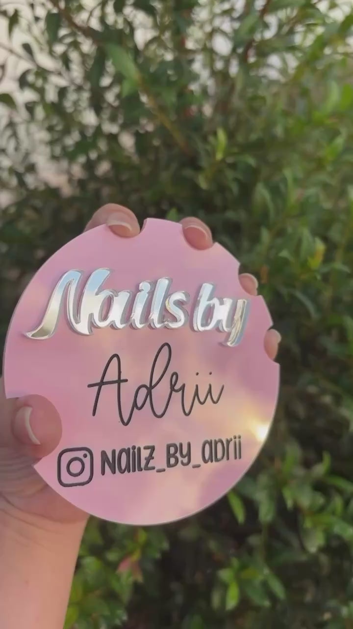 The personalized acrylic nailfie prop is a great way to elevate the way people view your nail art. This prop looks 3-D with a phrase Nails by and the rest of the wording will be engraved into the acrylic and painted black for reading purposes—- unless you choose black acrylic then the wording will be painted white. The nailfie prop is completely personalized to the color of the background meaning the disk and the color of the phrase "Nails by". You can add your name and Instagram or TikTok handle correctly at notes to seller at check out. It is important to let me know whether this is a TikTok or Instagram handle so I can put the correct logo.