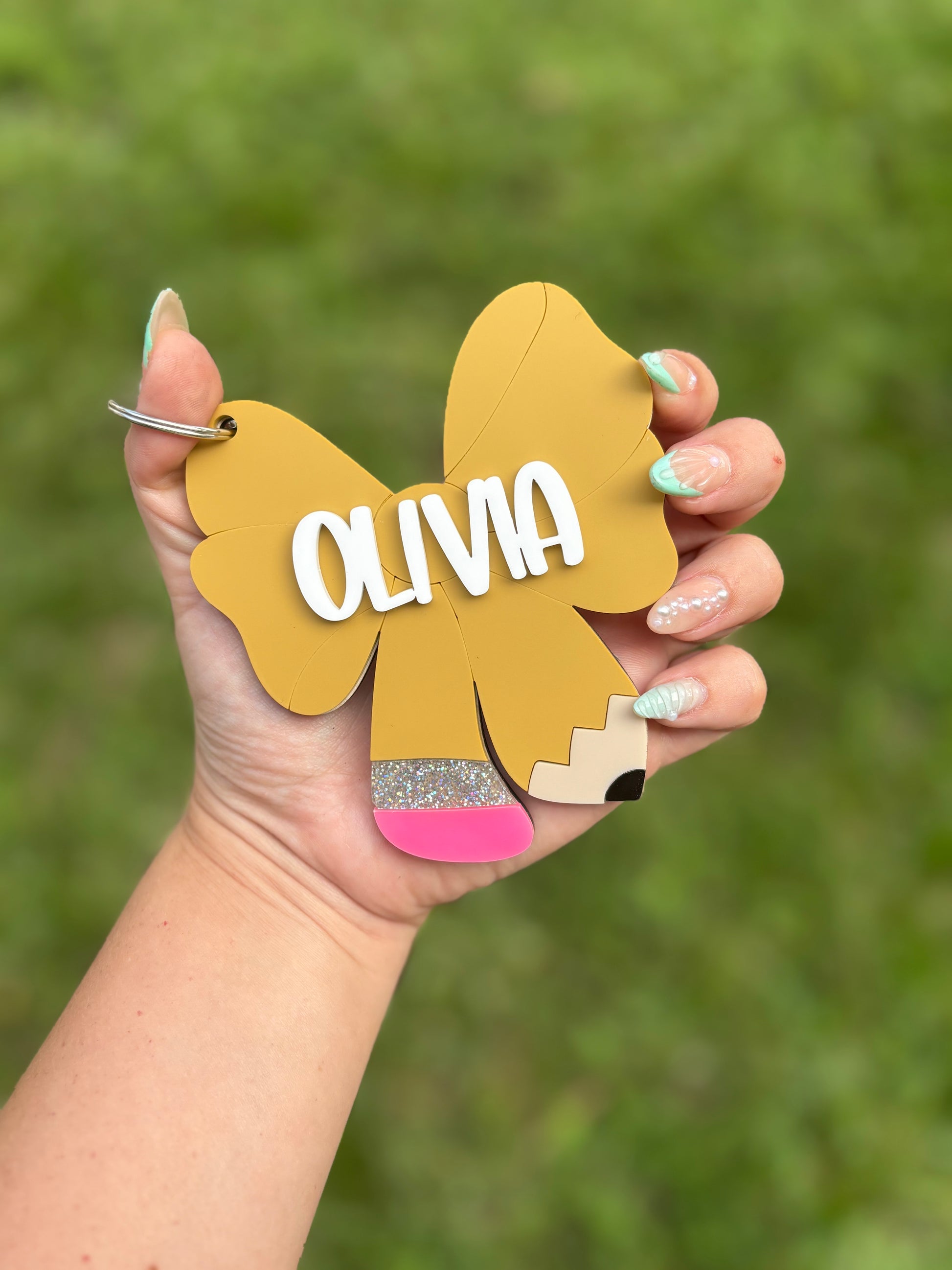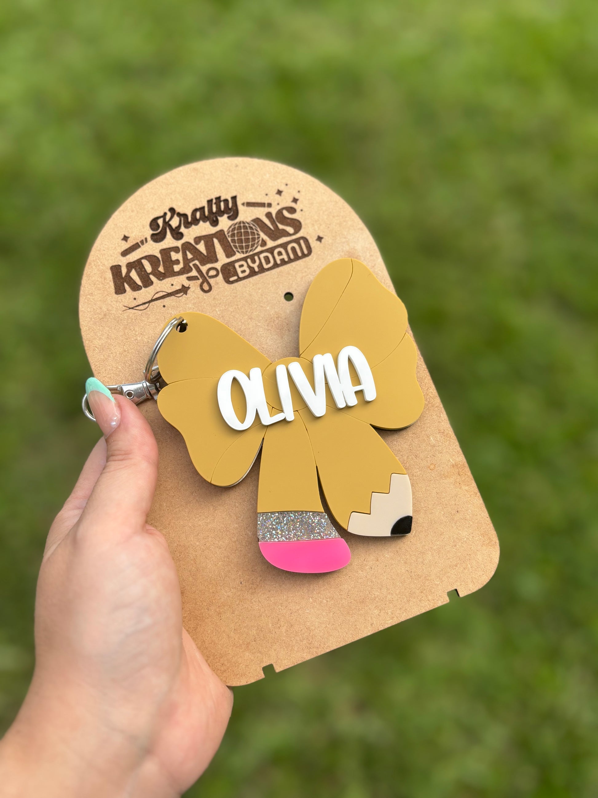 Add a touch of cute and colorful fun to your keys, backpacks, or teacher bags with this adorable personalized bow keychain! Made from high-quality layered acrylic, this keychain features a playful bow design with a pencil tip accent—perfect for teachers, students, or back-to-school gifts.