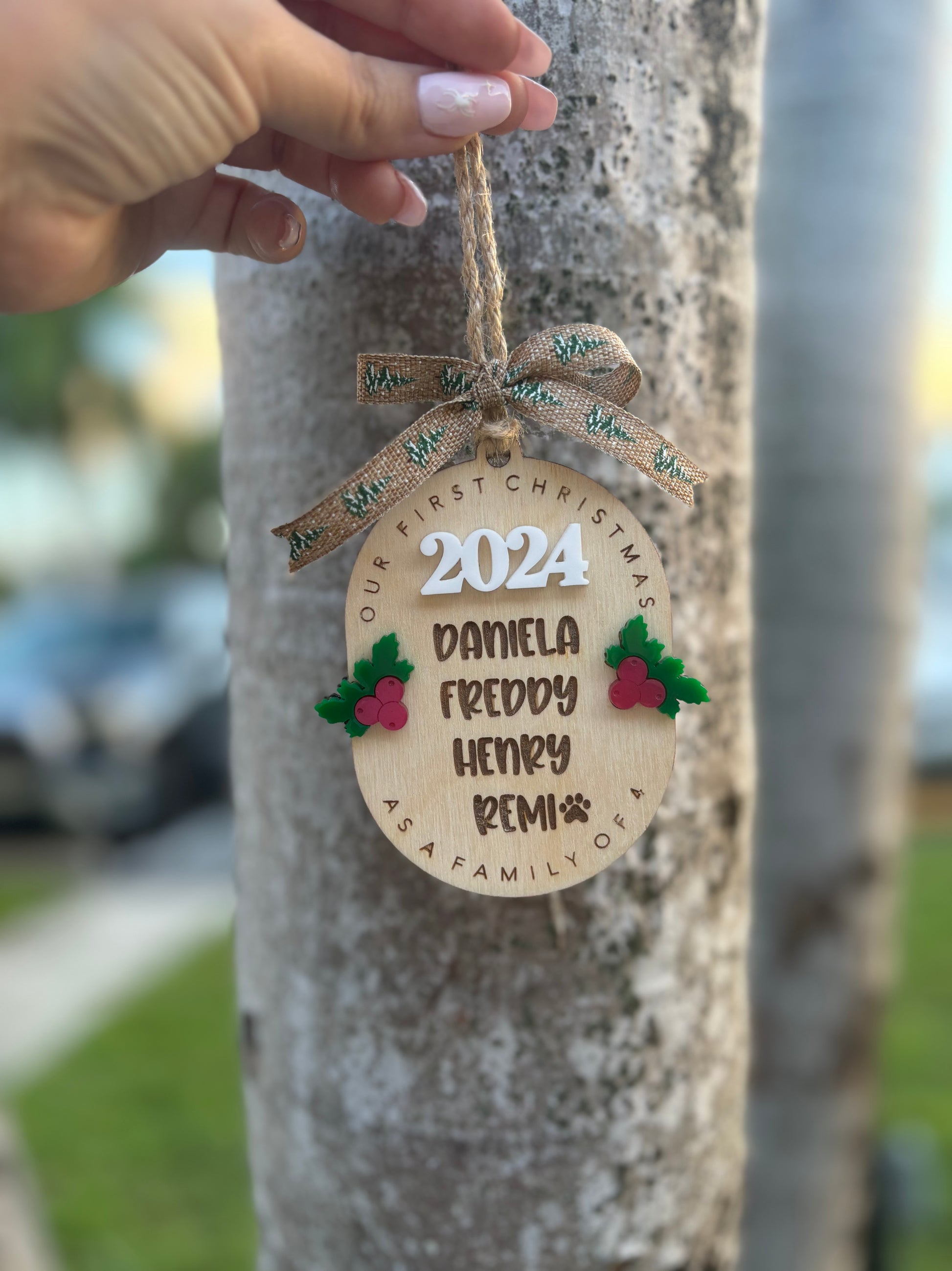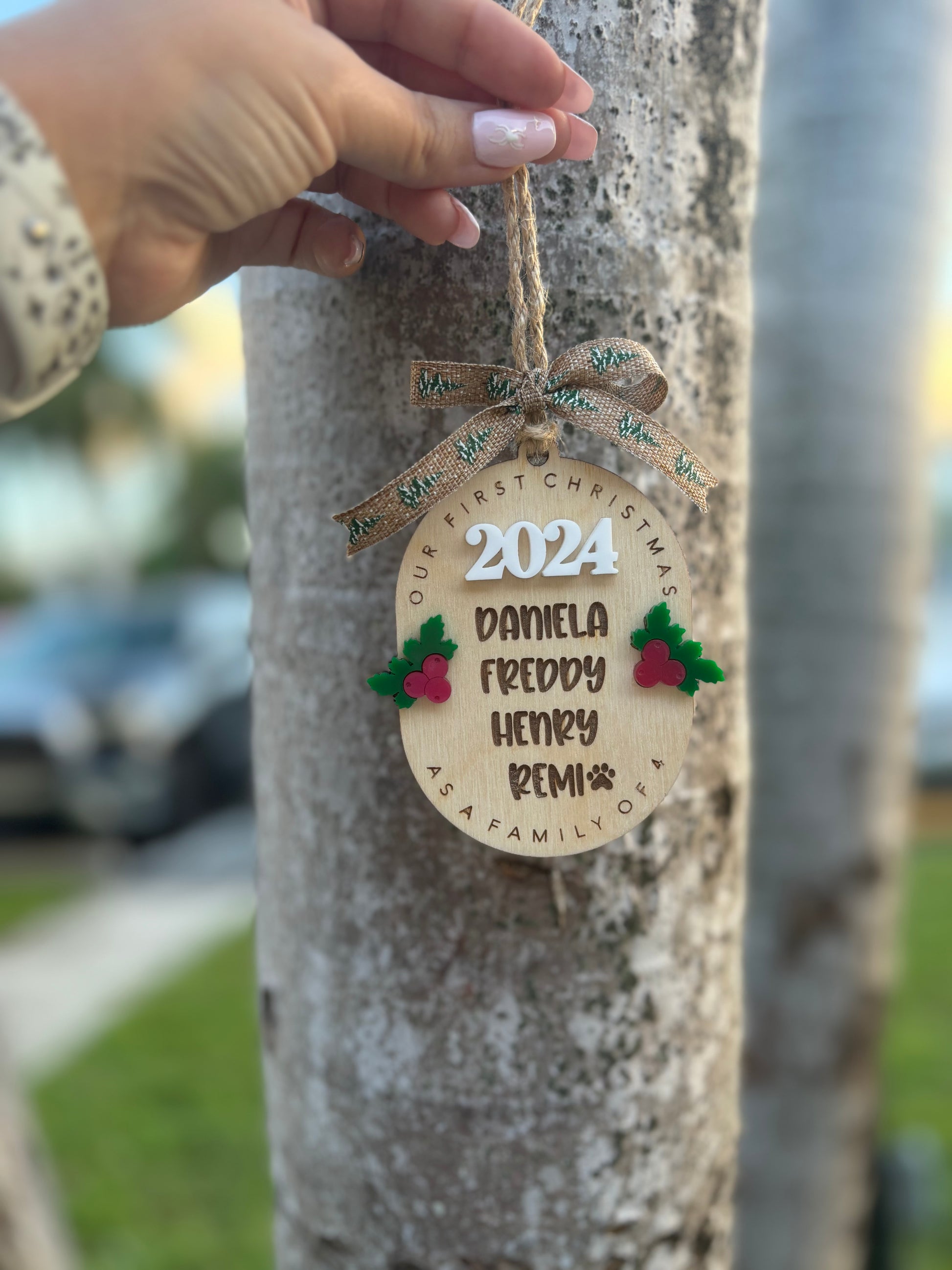 Looking for a personalized family ornament that can include up to a family of 8? If including pets please specify which name is the pet. Look no further than this ornament! Made from birch wood and acrylic, this ornament is both durable and lightweight, making it easy to hang on a Christmas tree or display in a home. The birch wood material is also eco-friendly and sustainable, making it a great choice for those who are environmentally conscious.