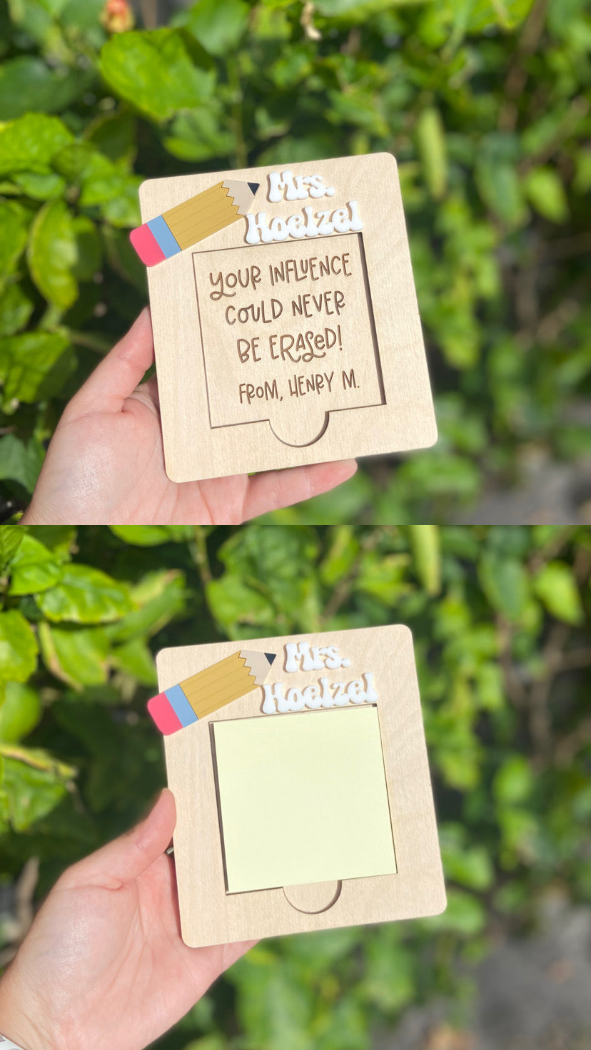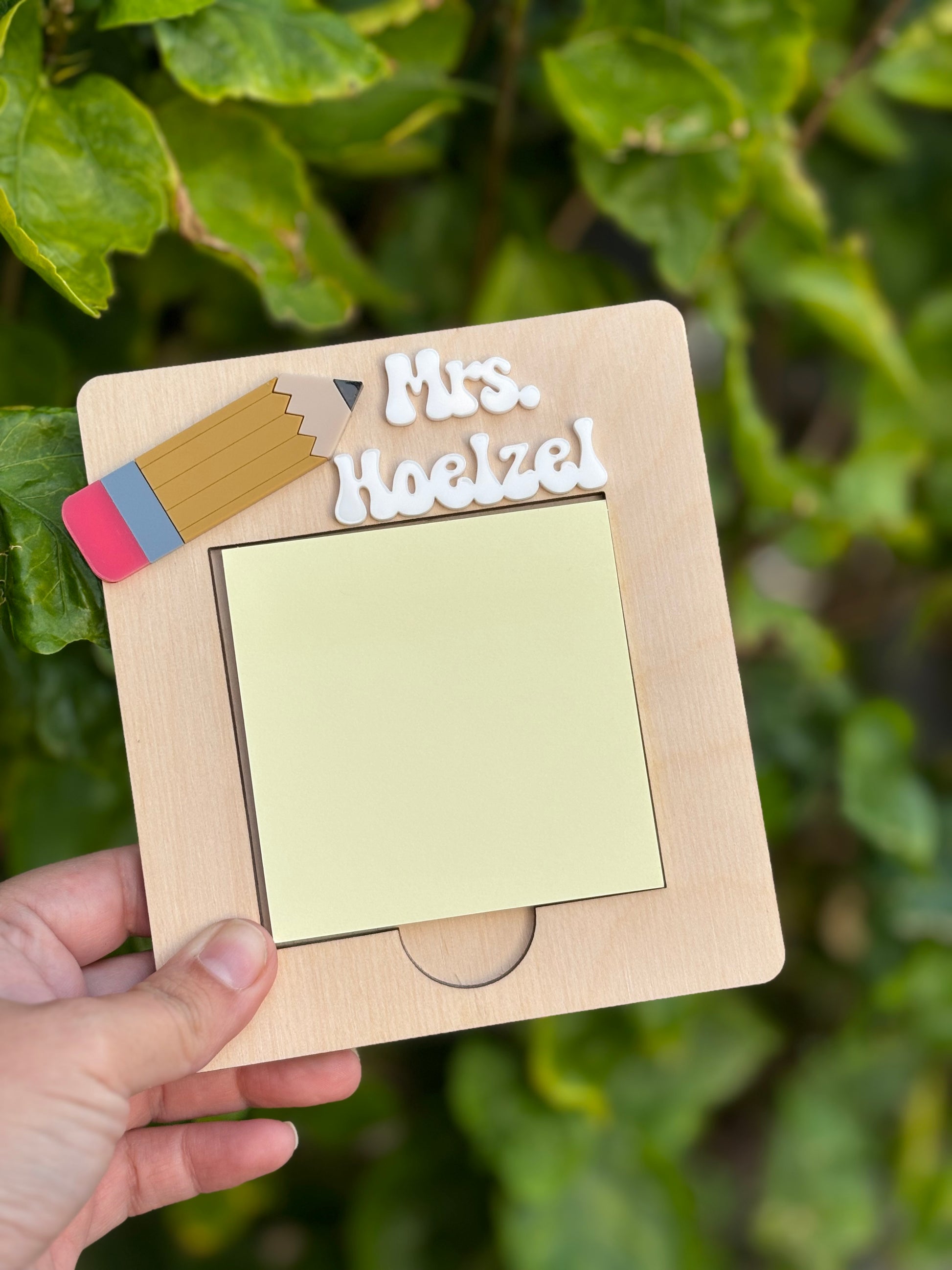 Introducing our personalized sticky notes holder. Perfect for teachers appreciation and holiday gift. These sticky note holders hold a 3 x 3 posted pad. Holder is made from Birchwood has 1/4 thickness and the cute little pencil is made of acrylic giving it that 3-D Look.