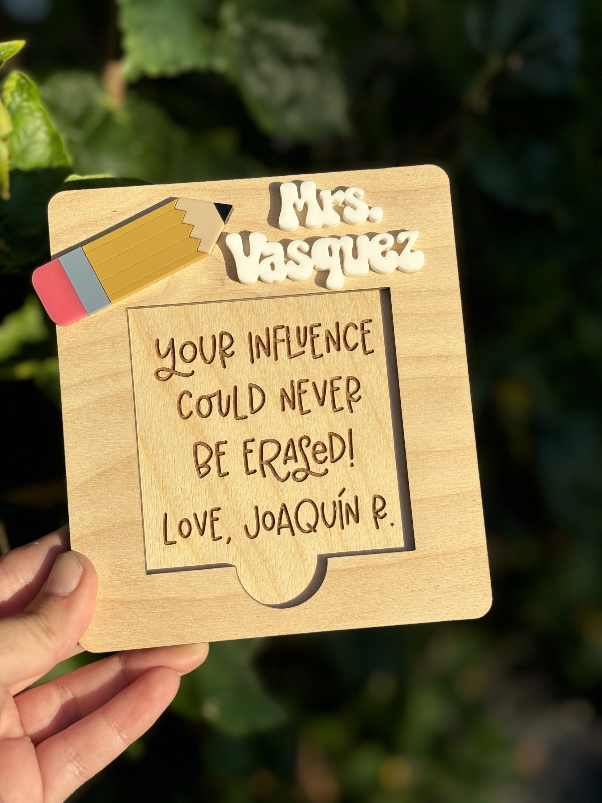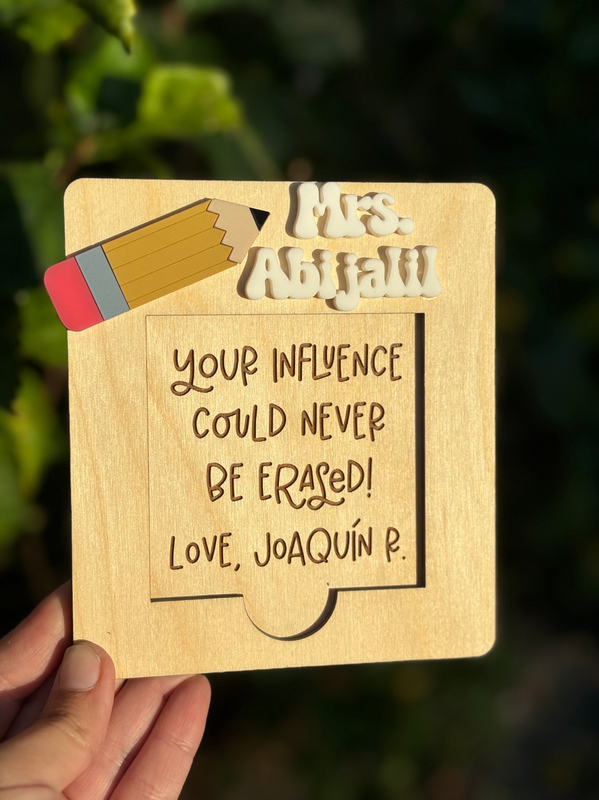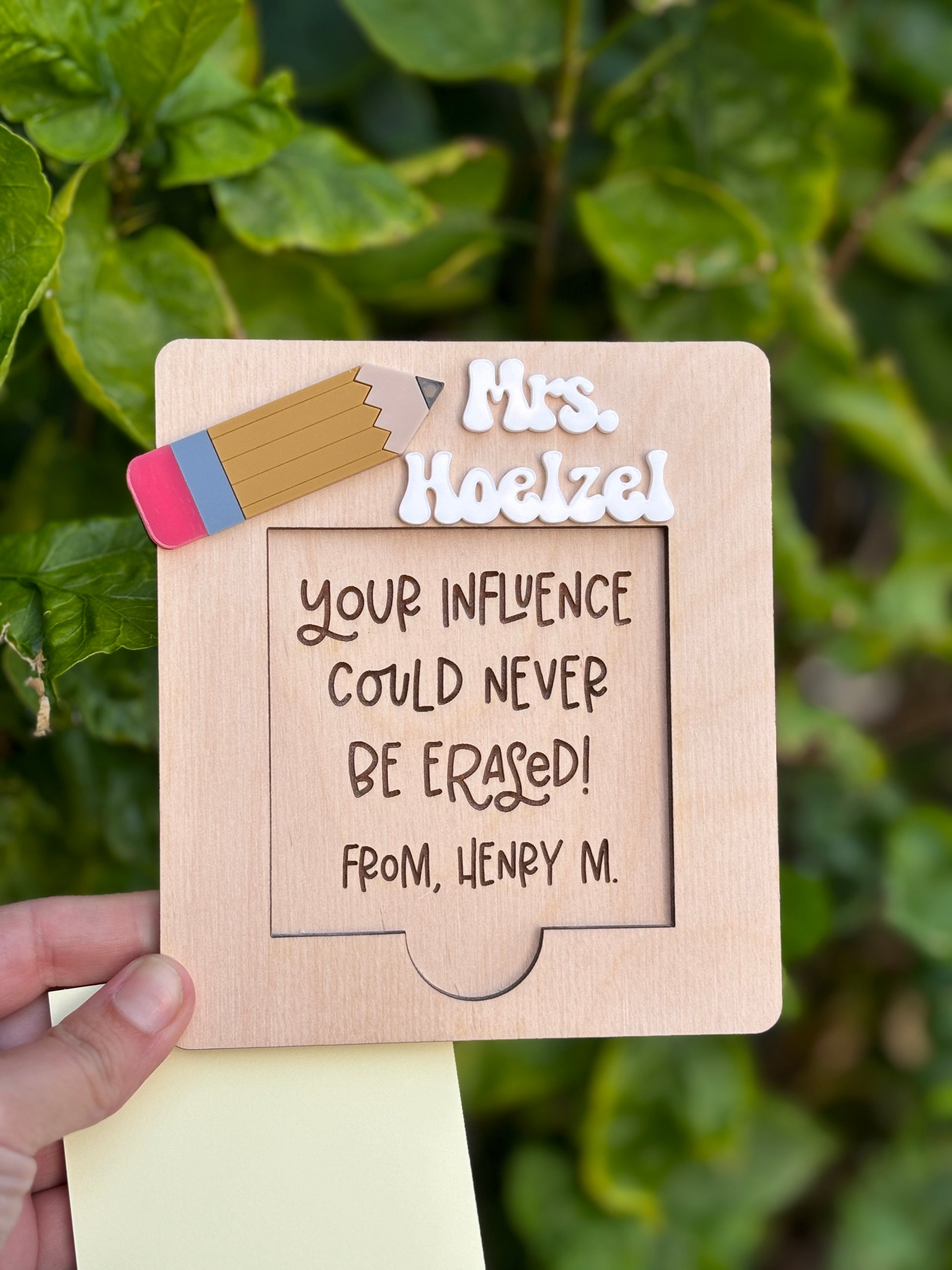 This comes with one set of sticky note. Please note that the inside wording will say "Your Influence Could Never Be Erased!" followed by your child's name.