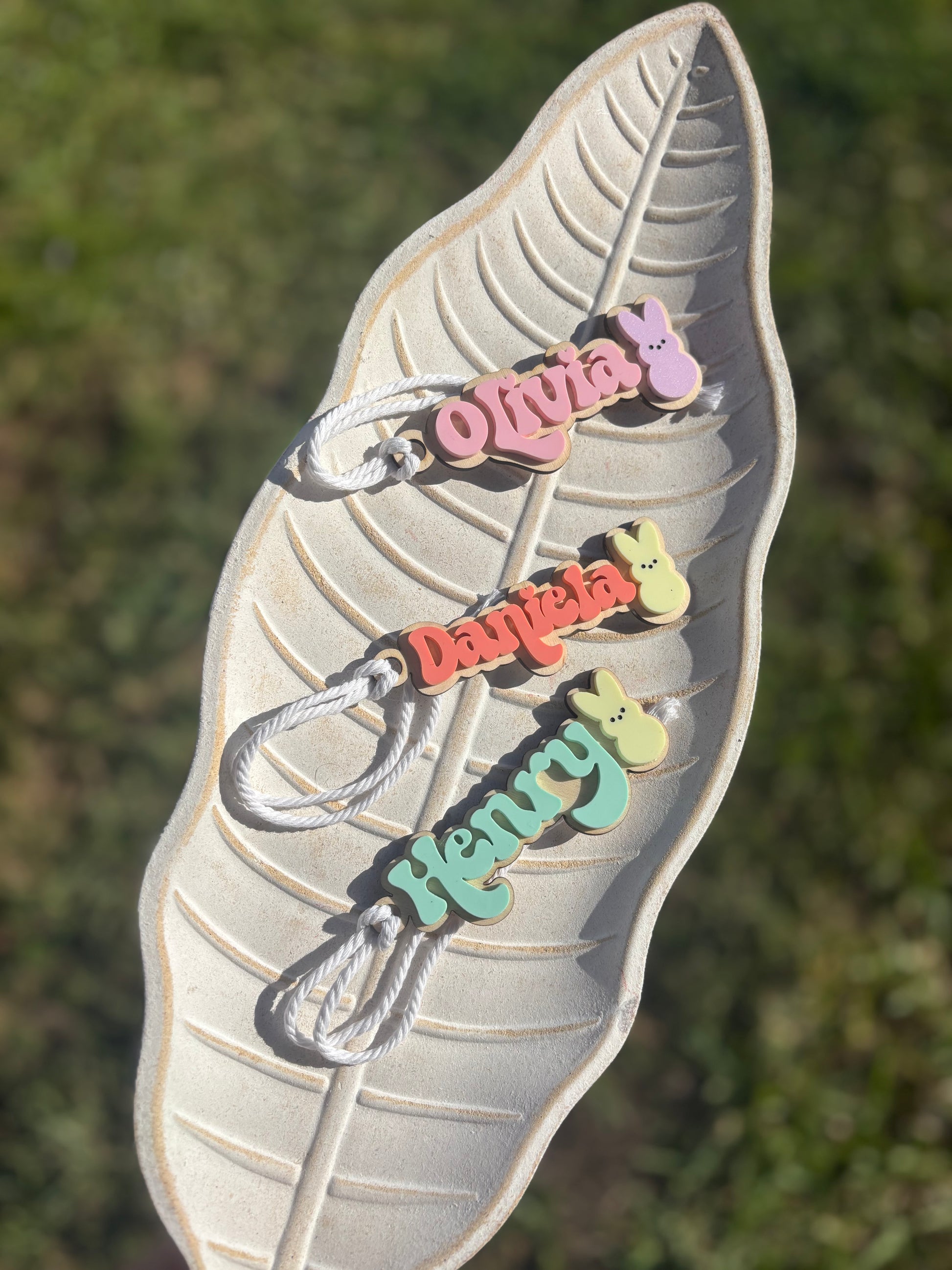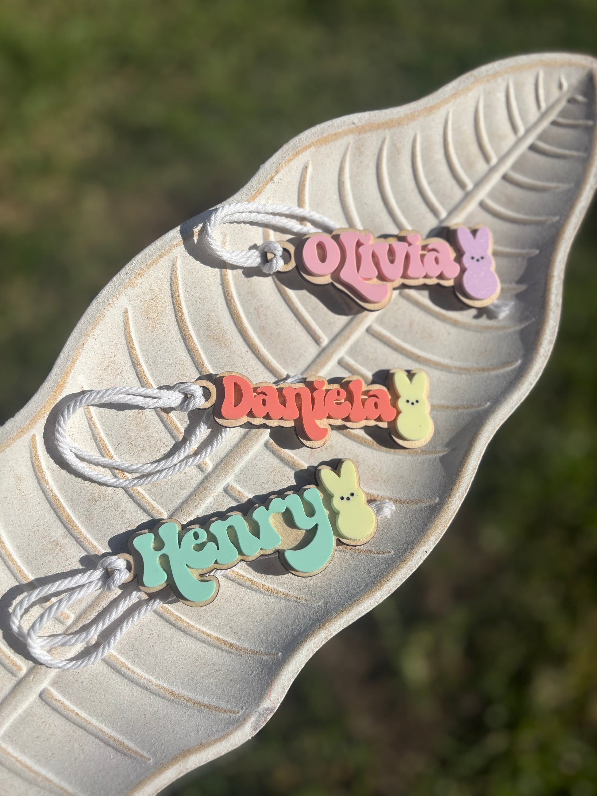 The Easter tag measures about 4 inches in length. Please note that the longer the name the tag will appear smaller. regardless of the length of the name the tag will be 4 inches in length. The tag is made from 1/8 Birchwood and 1/8 layered acrylic. The tags will come with white yarn to be tied on the basket. The font on the tag is set.