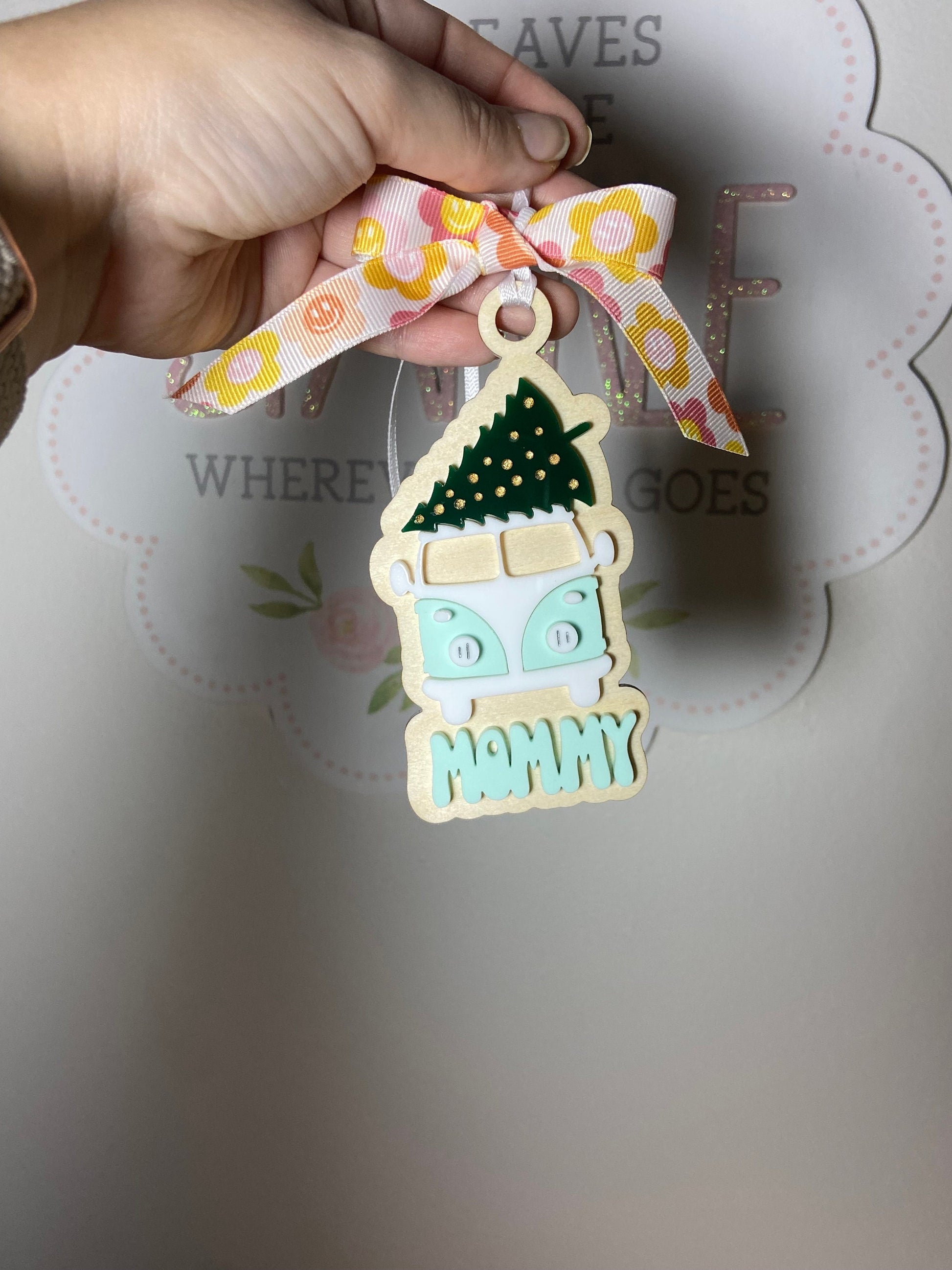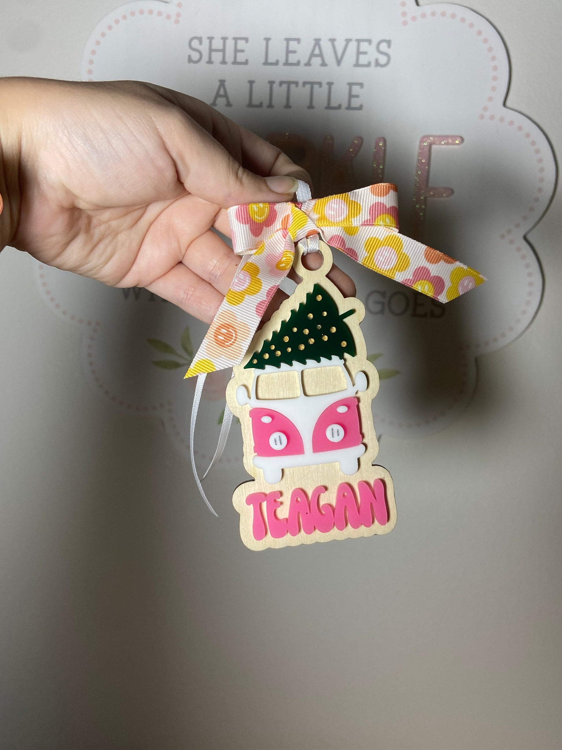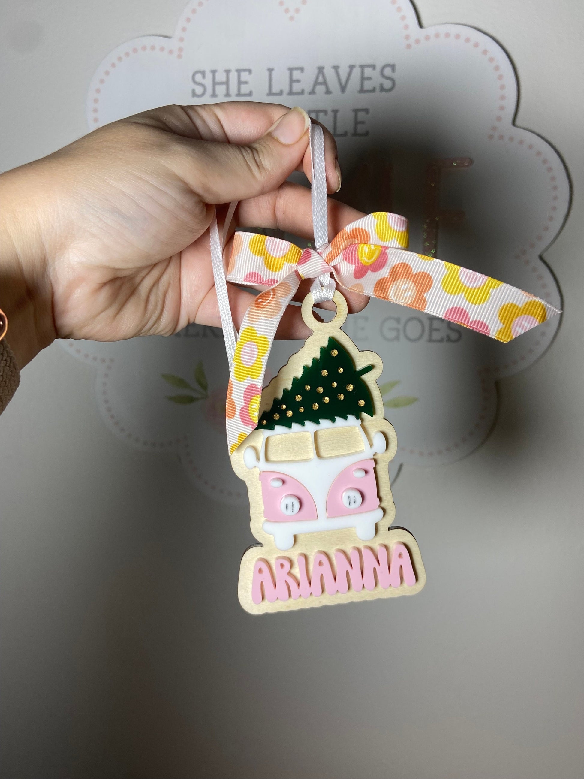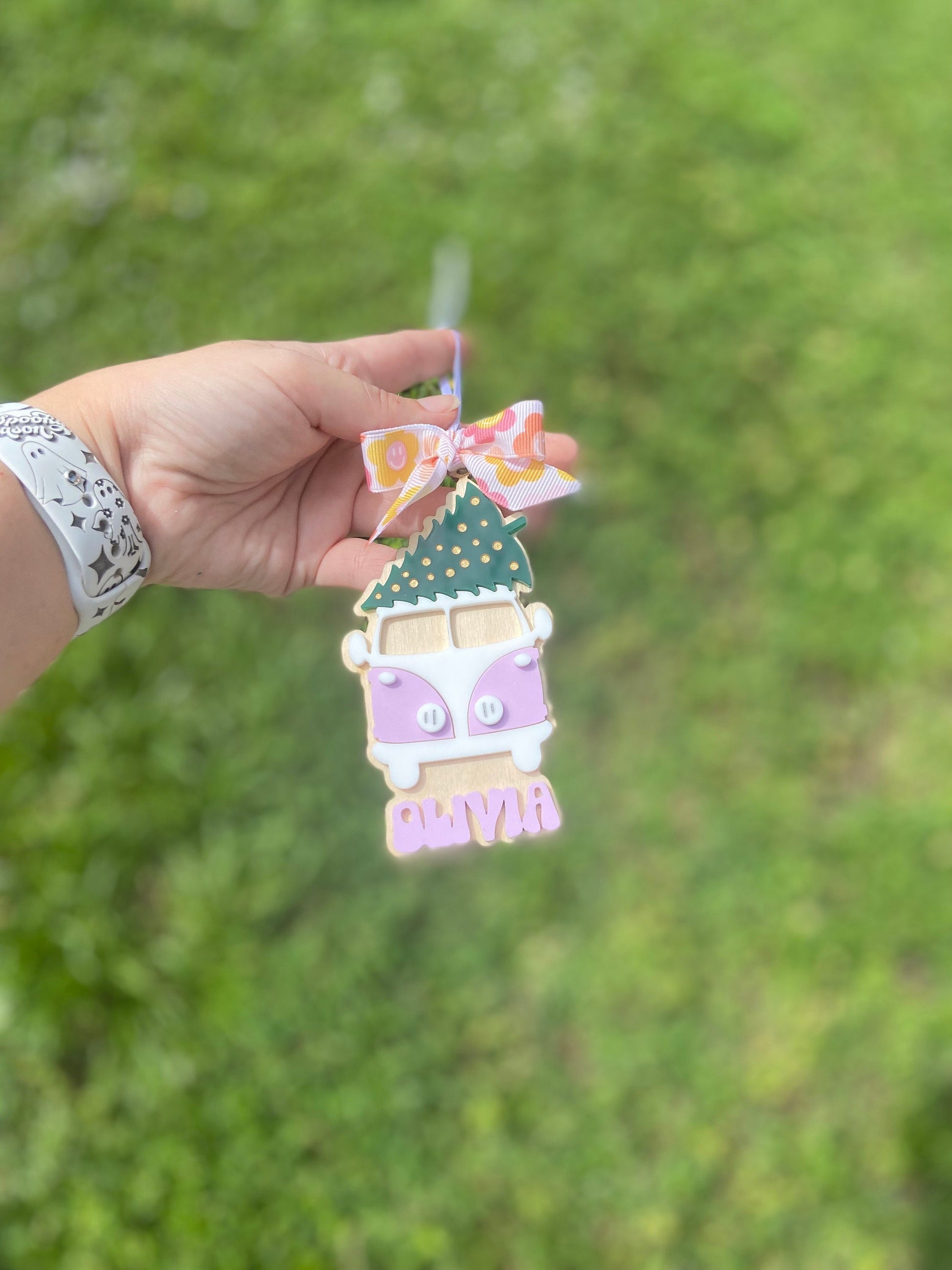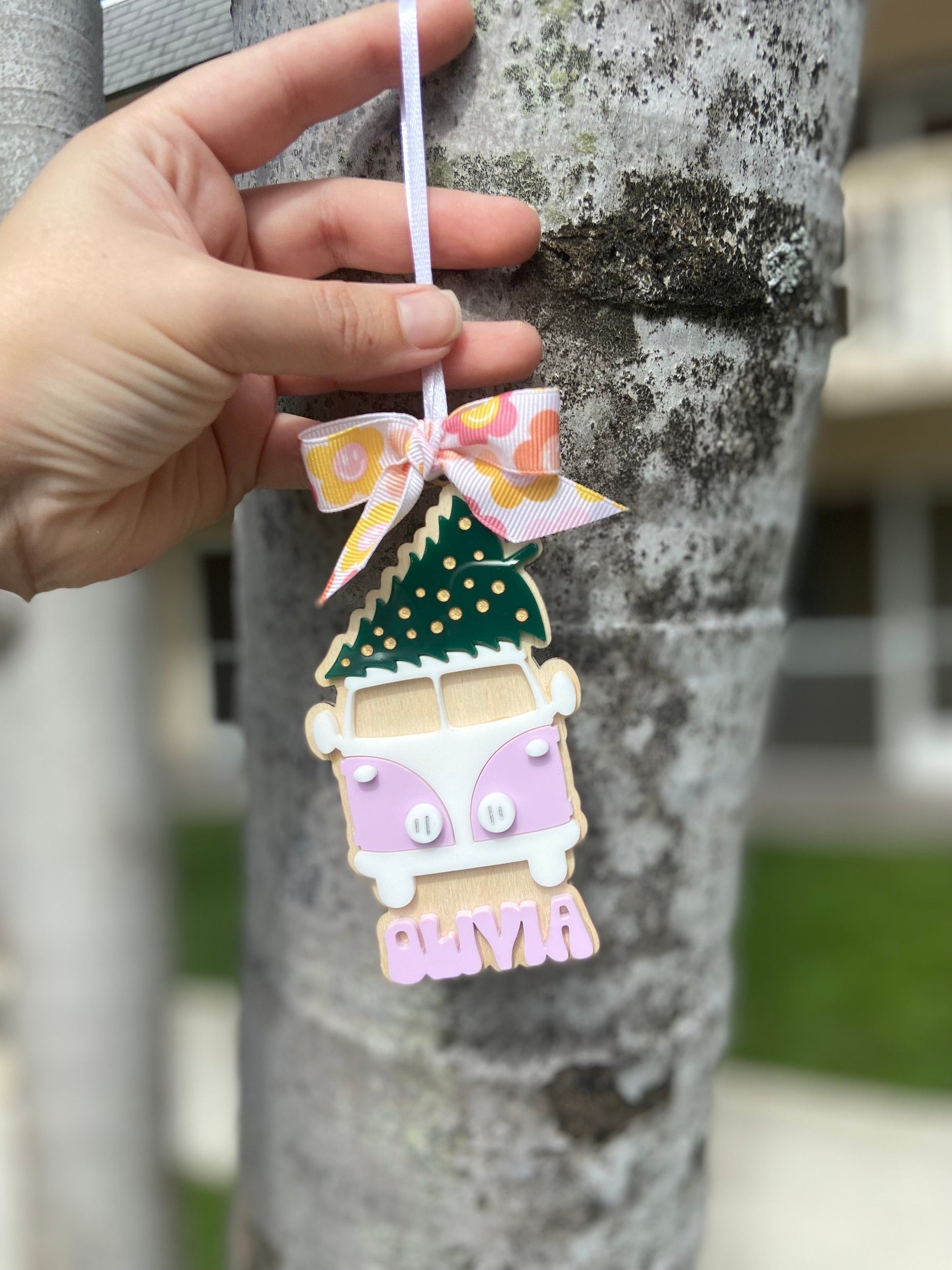 how cute is this retro van acrylic and wood ornament. The one pictured is lilac. Please choose from the menu the color of the name which will match the van.