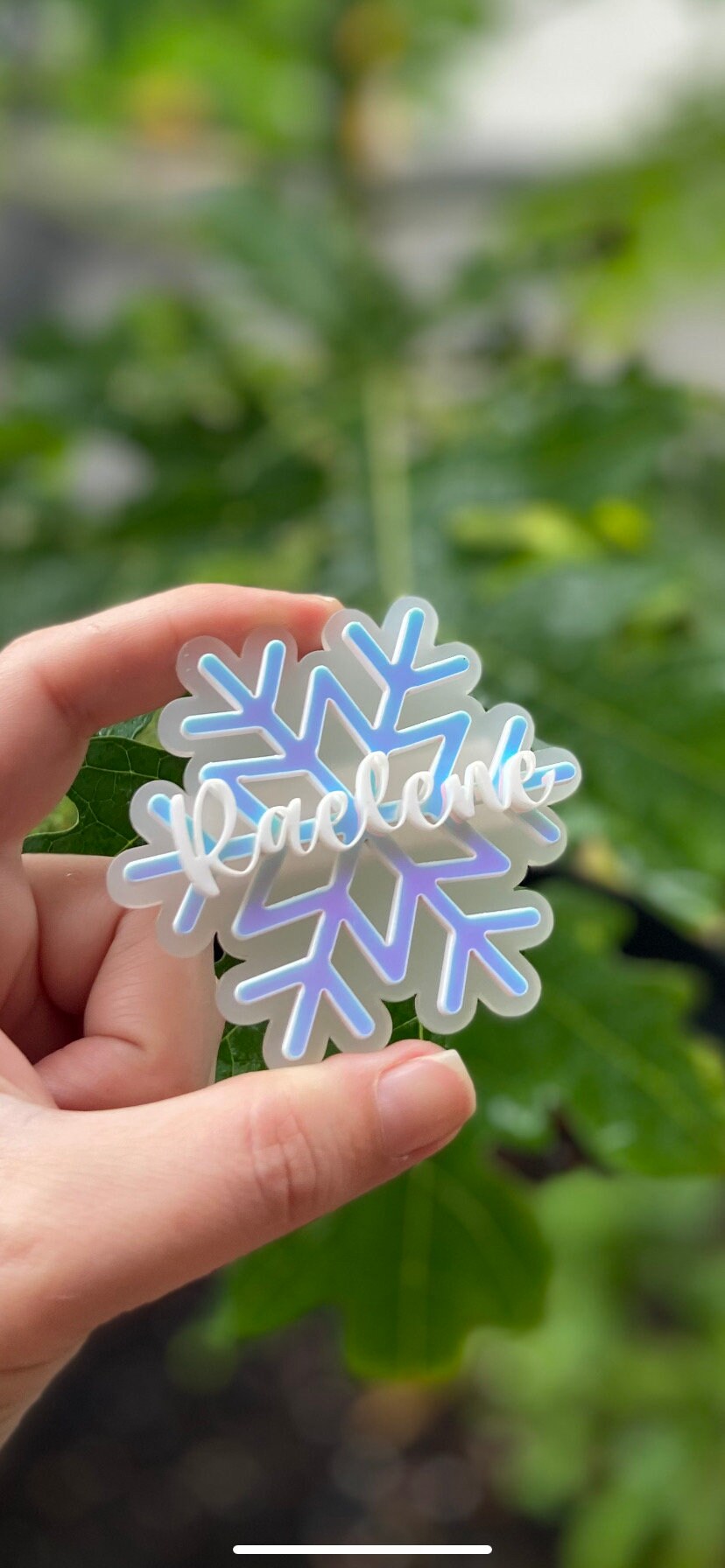 The product is 1/8 acrylic and its stacked with 1/8 color iridescent snowflake acrylic, person’s name is also acrylic. please choose the name color. Font is set.