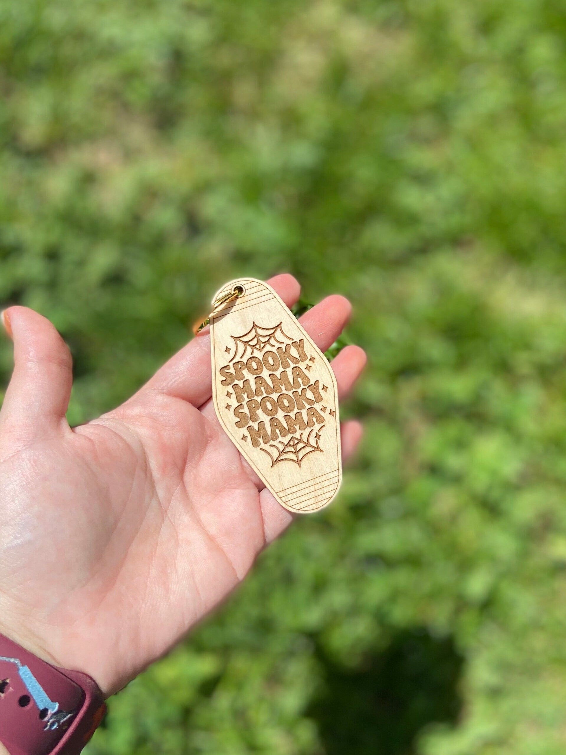 How cute is this spooky mama keychain? It's great for a keychain or to attach to your bags, diaper bags and more! The image is engraved into wood so no worries of the image coming off.