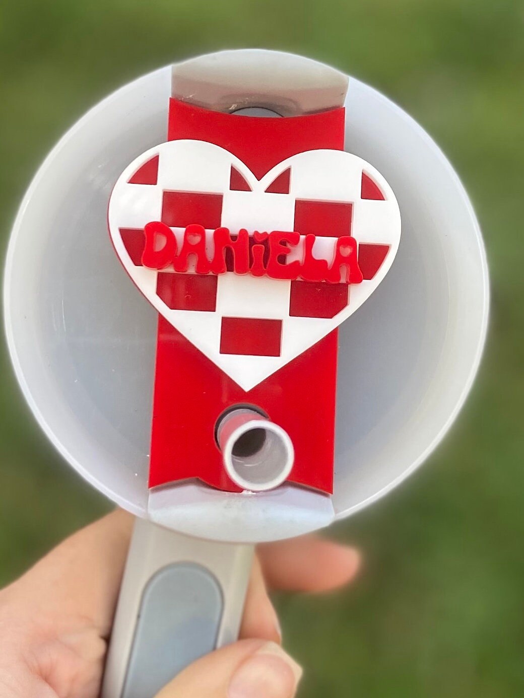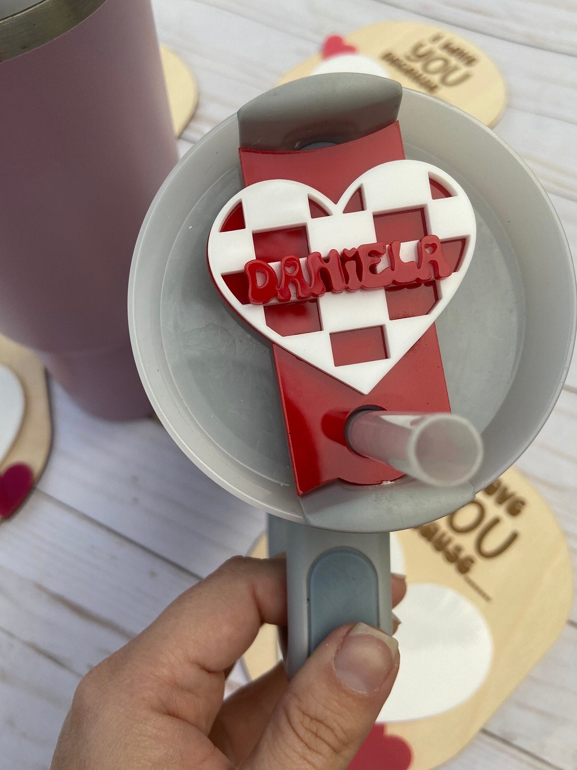 Valentine’s Day Stanley topper, checkered heart Stanley topper, checkered Stanley topper, Stanley name plate, valentines name plate