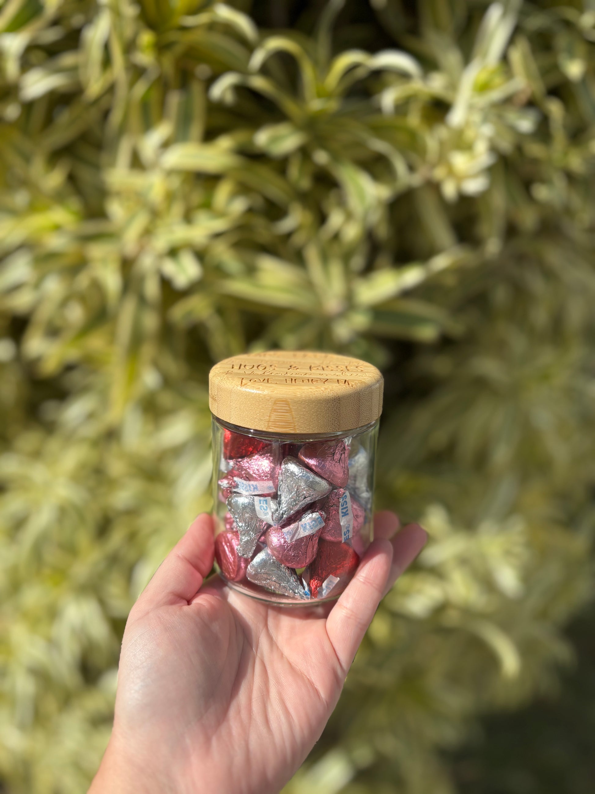 This listing is for a personalize glass jar with a bamboo top. The top will include the following message: (Teachers name) you deserve all the hugs and kisses and valentine wishes love — (your child’s name).