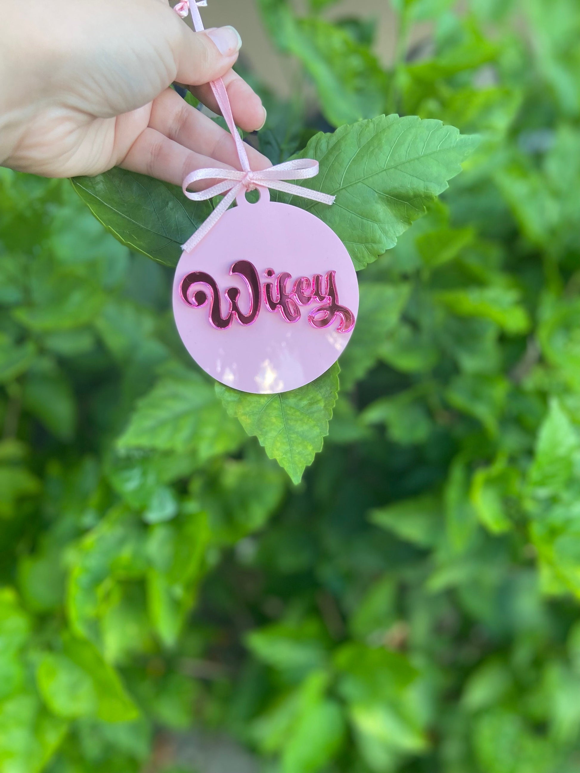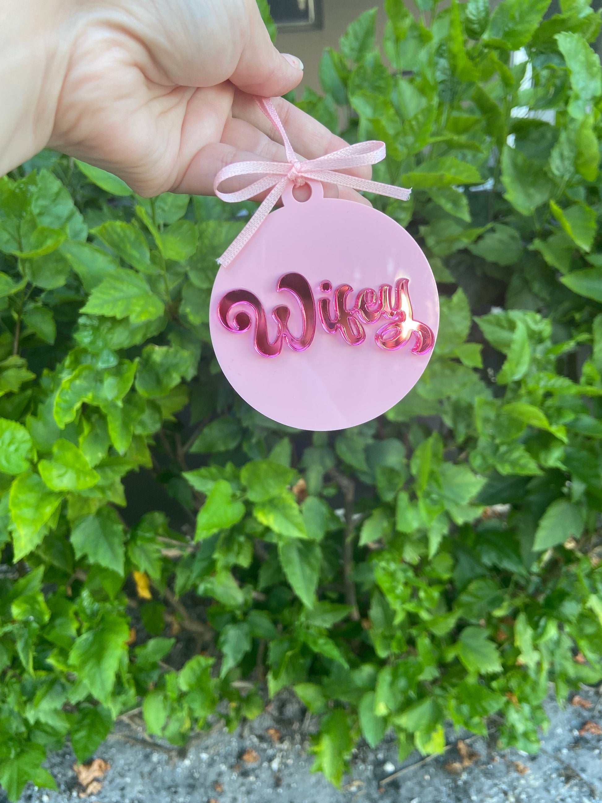 how cute is this Wifey acrylic ornament. The one pictured is pink. Please choose from the menu the ornament color you and the “Wifey” color you would like (the one pictured is pink mirror.)