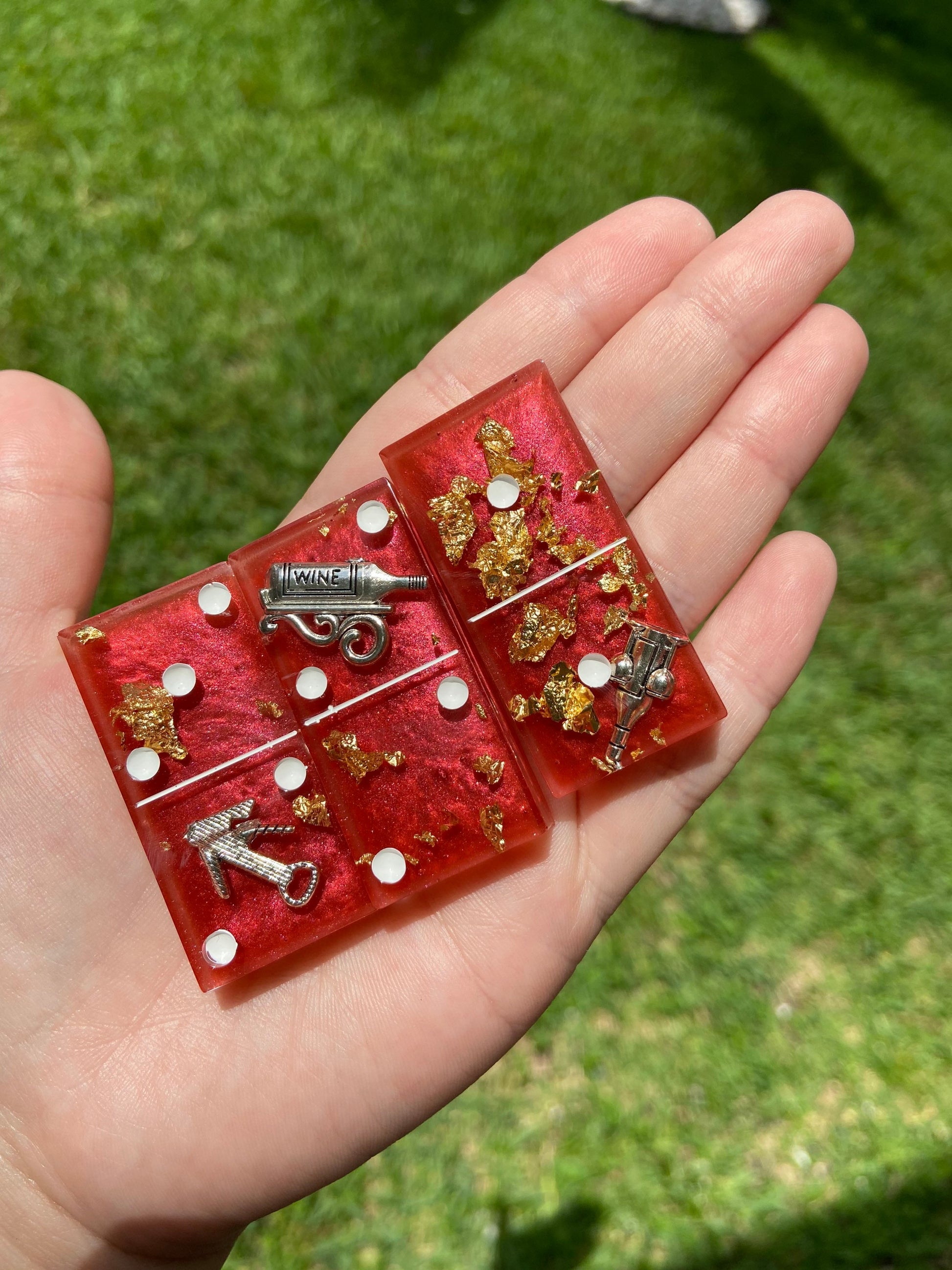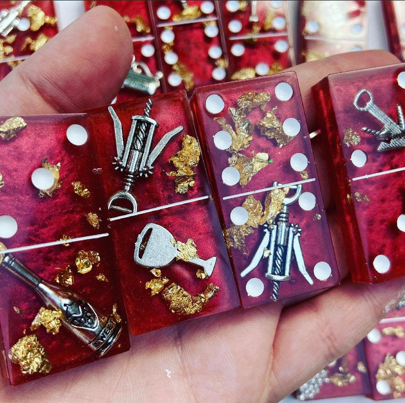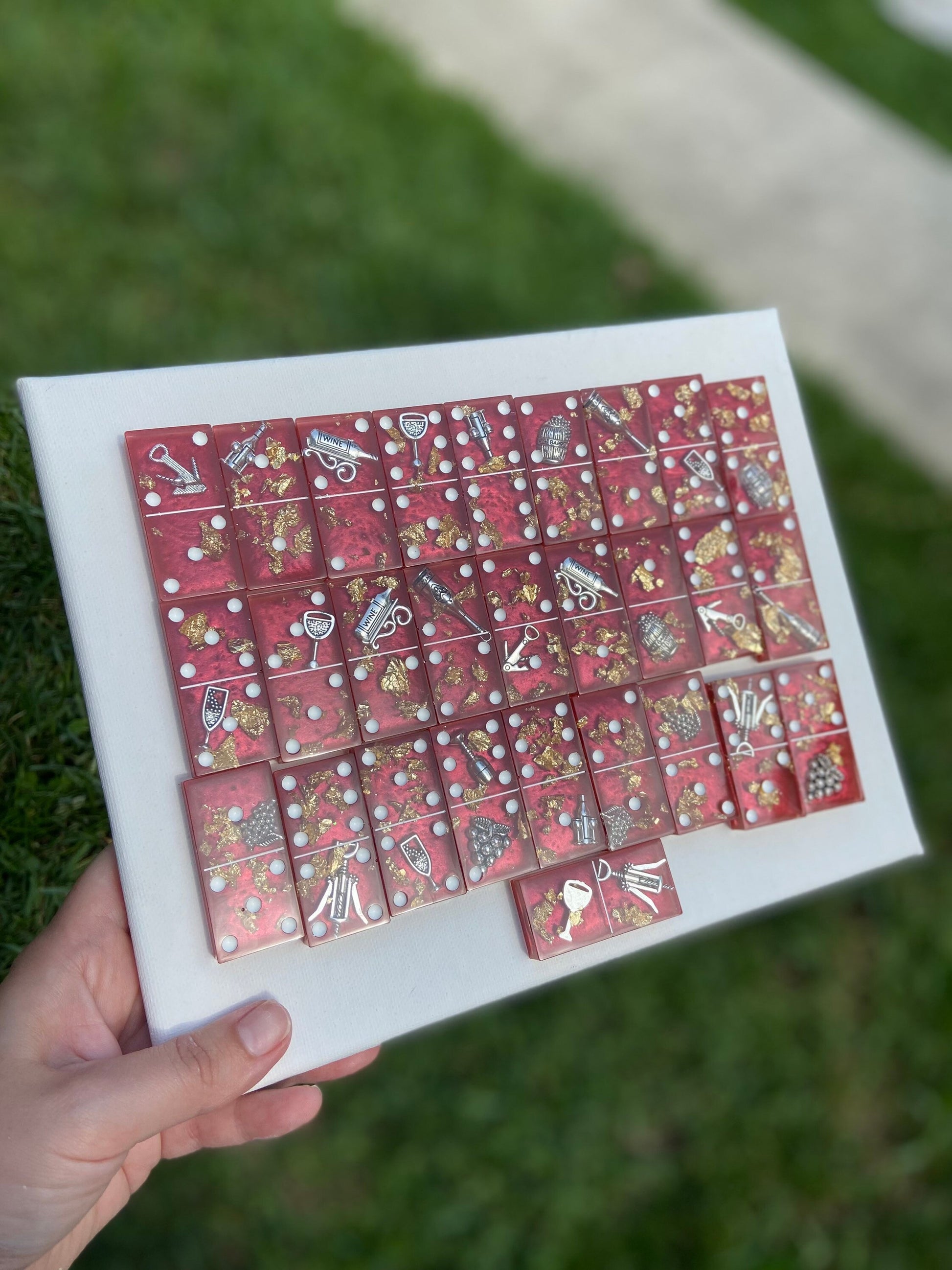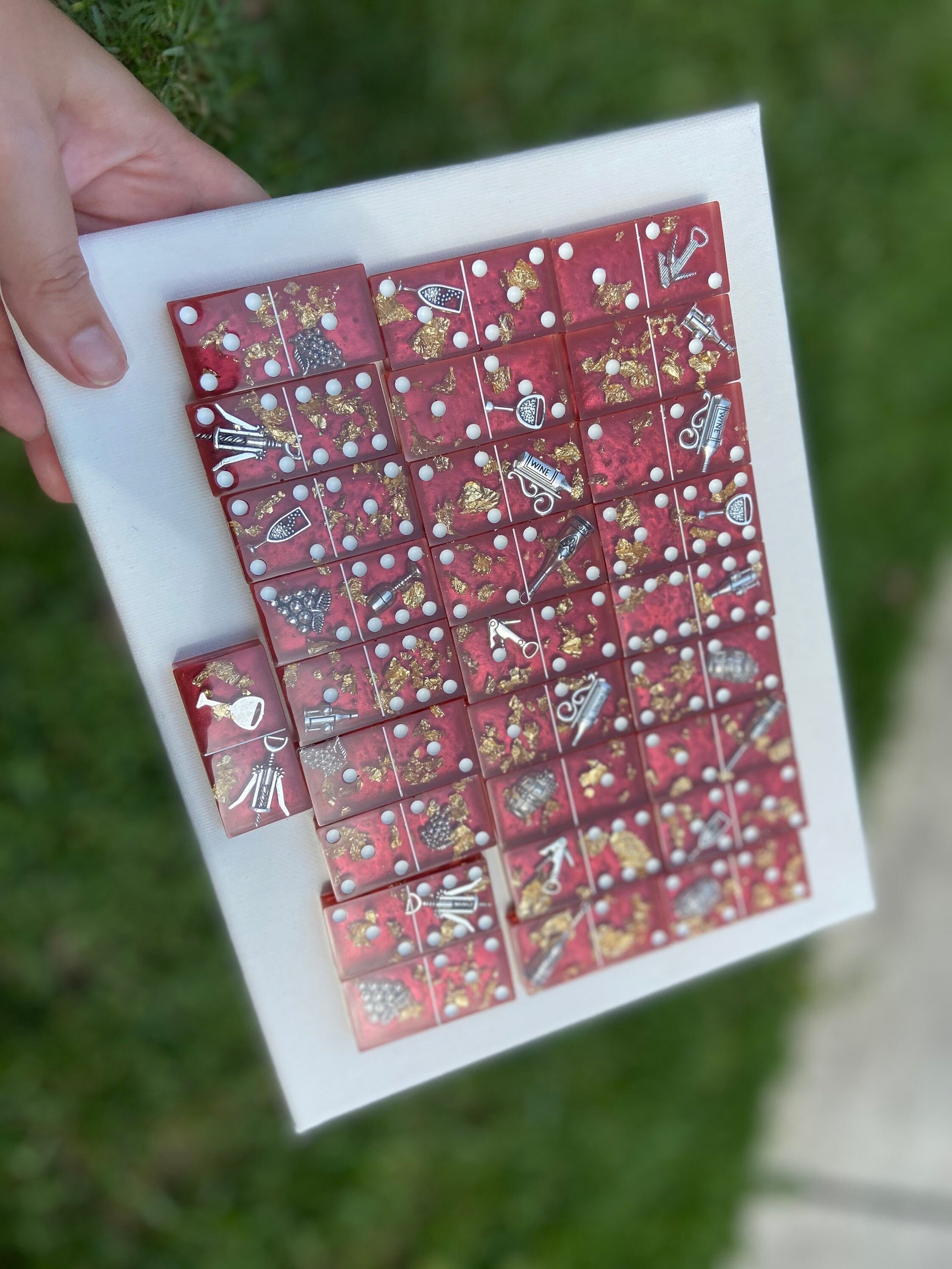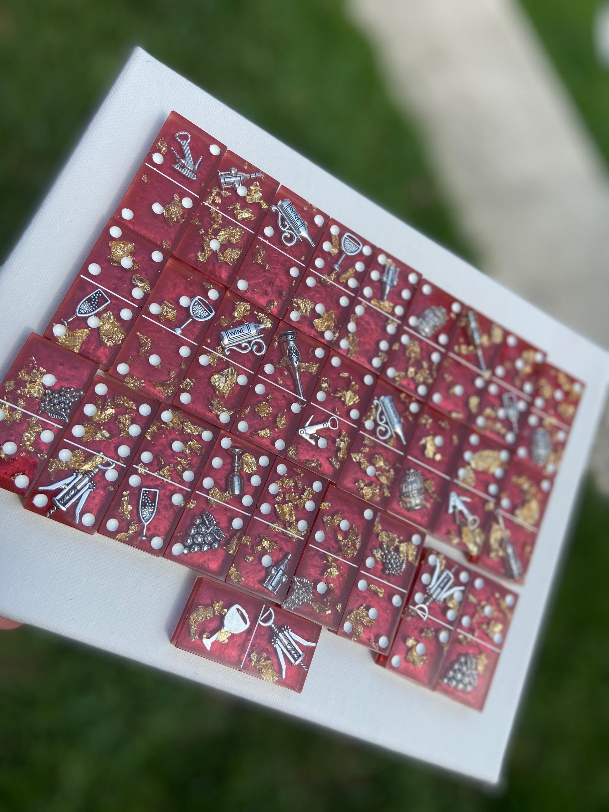 This listing is for a full set of 28 pieces (double 6) dominoes set. This set is one of a kind inside the dominoes you have different wine accessories such as: wine bottles, wine bottle openers, wine barrels, wine glasses, and grapes. The back of the dominoes are red and the pips are painted by hand in the color white.